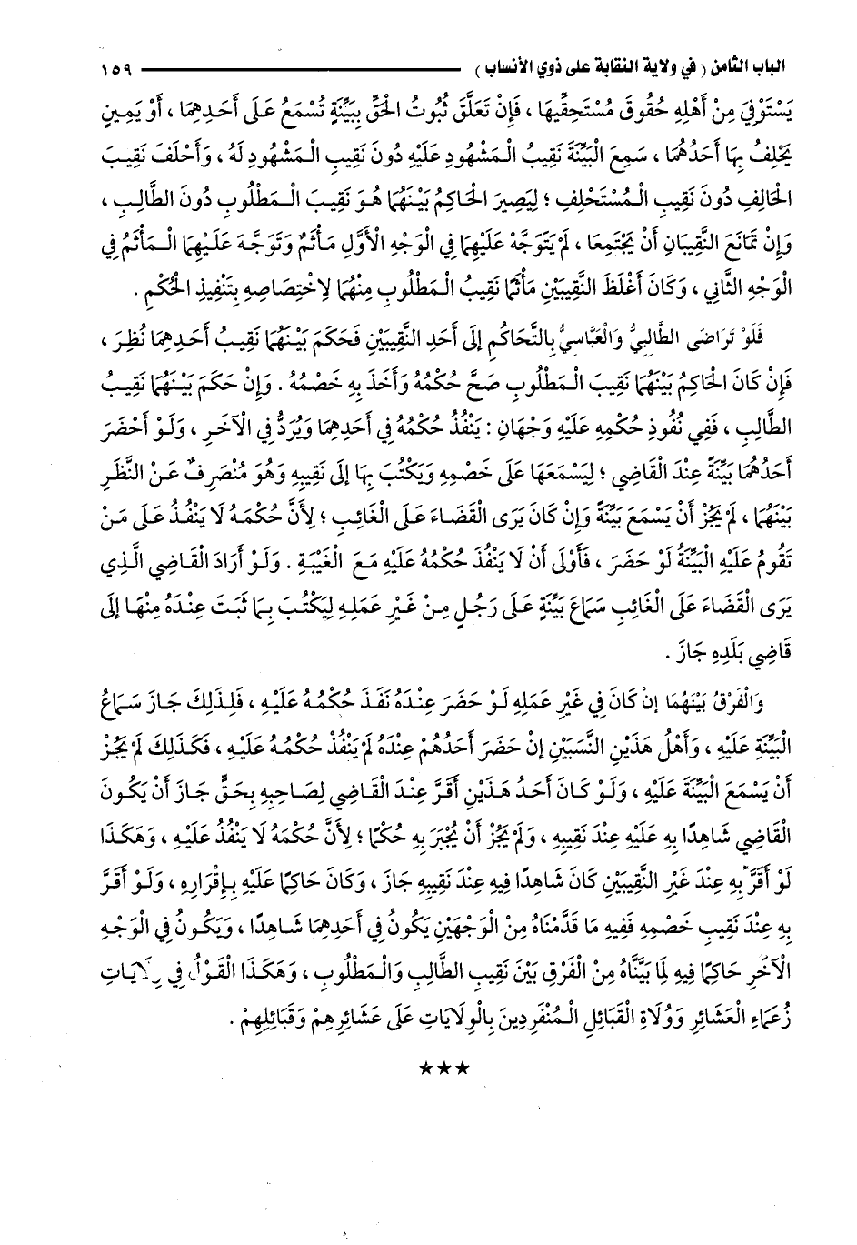 يَسْتَوْفِيَ مِنْ أَهْلِهِ حُقُوقَ مُسْتَحِقِّيهَا، فَإِنْ تَعَلَّقَ ثُبُوتُ الْحَقِّ بِبَيِّنَةٍ تُسْمَعُ عَلَى أَحَدِهِمَا، أَوْ يَمِينٍ يَحْلِفُ بِهَا أَحَدُهُمَا، سَمِعَ الْبَيِّنَةَ نَقِيبُ الْمَشْهُودِ عَلَيْهِ دُونَ نَقِيبِ الْمَشْهُودِ لَهُ، وَأَحْلَفَ نَقِيبَ الْحَالِفِ دُونَ نَقِيبِ الْمُسْتَحْلِفِ؛ لِيَصِيرَ الْحَاكِمُ بَيْنَهُمَا هُوَ نَقِيبَ الْمَطْلُوبِ دُونَ الطَّالِبِ، وَإِنْ تَمَانَعَ النَّقِيبَانِ أَنْ يَجْتَمِعَا، لَمْ يَتَوَجَّهْ عَلَيْهِمَا فِي الْوَجْهِ الْأَوَّلِ مَأْثَمٌ، وَتَوَجَّهَ عَلَيْهِمَا الْمَأْثَمُ فِي الْوَجْهِ الثَّانِي، وَكَانَ أَغْلَظَ النَّقِيبَيْنِ مَأْثَمًا نَقِيبُ الْمَطْلُوبِ مِنْهُمَا؛ لِاخْتِصَاصِهِ بِتَنْفِيذِ الْحُكْمِ.