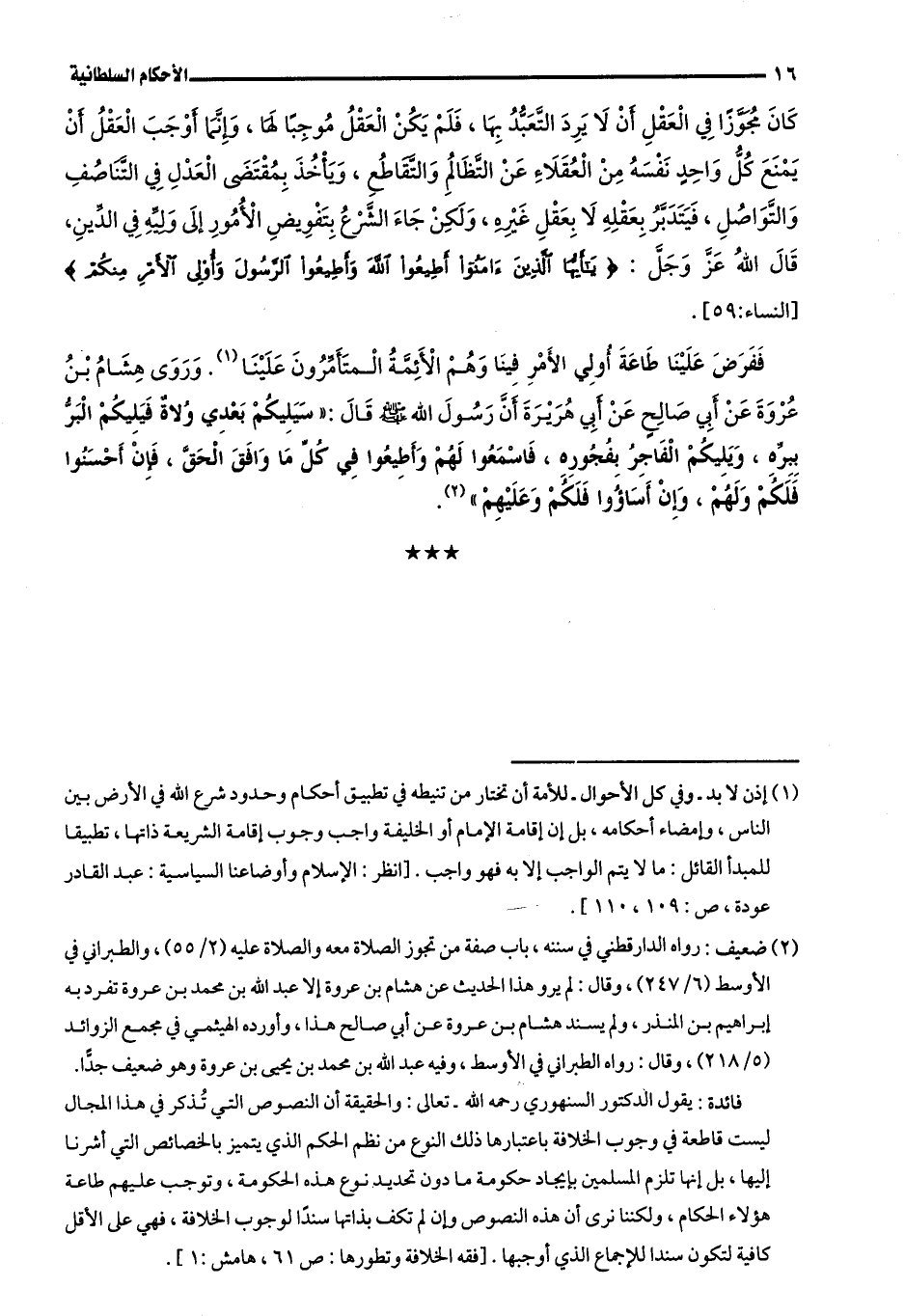 فائدة: يقول الدكتور السنهوري -رحمه الله تعالى: والحقيقة أنَّ النصوص التي تذكر في هذا المجال ليست قاطعة في وجوب الخلافة باعتبارها ذلك النوع من نظم الحكم الذي يتميز بالخصائص التي أشرنا إليها، بل إنَّها تلزم المسلمين بإيجاد حكومة ما دون تحديد نوع هذه الحكومة، وتوجب عليهم طاعة هولاء الحكَّام، ولكنَّنَا نرى أنَّ هذه النصوص وإن لم تكف بذاتها سندًا لوجوب الخلافة، فهي على الأقلِّ كافية لتكون سندًا للإجماع الذي أوجبها. "فقه الخلافة وتطورها: ص6، هامش: 1".