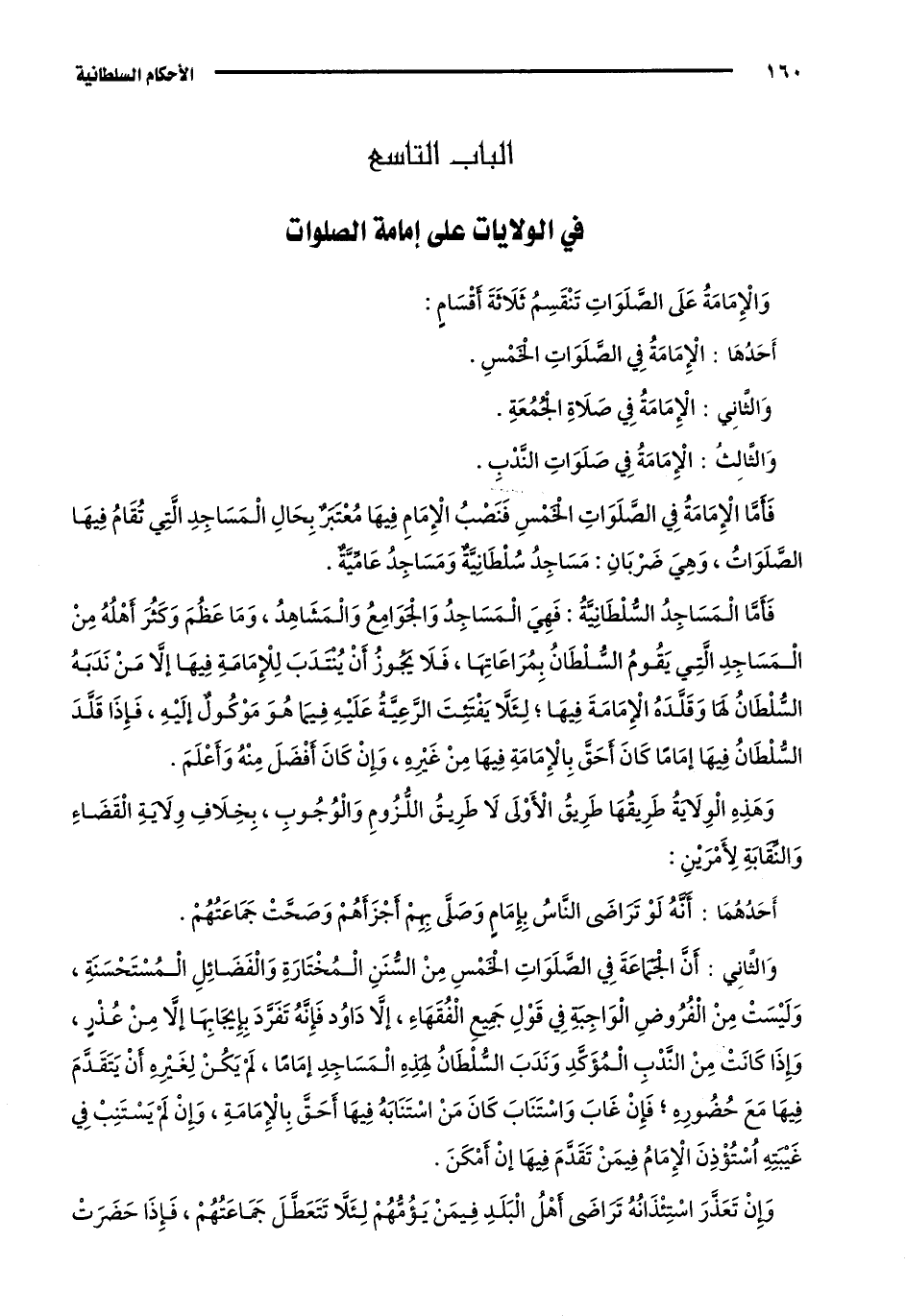 فَأَمَّا الْإِمَامَةُ فِي الصَّلَوَاتِ الْخَمْسِ فَنَصْبُ الْإِمَامِ فِيهَا مُعْتَبَرٌ بِحَالِ الْمَسَاجِدِ الَّتِي تُقَامُ فِيهَا الصَّلَوَاتُ، وَهِيَ ضَرْبَانِ: مَسَاجِدُ سُلْطَانِيَّةٌ وَمَسَاجِدُ عَامّيَّةٌ.