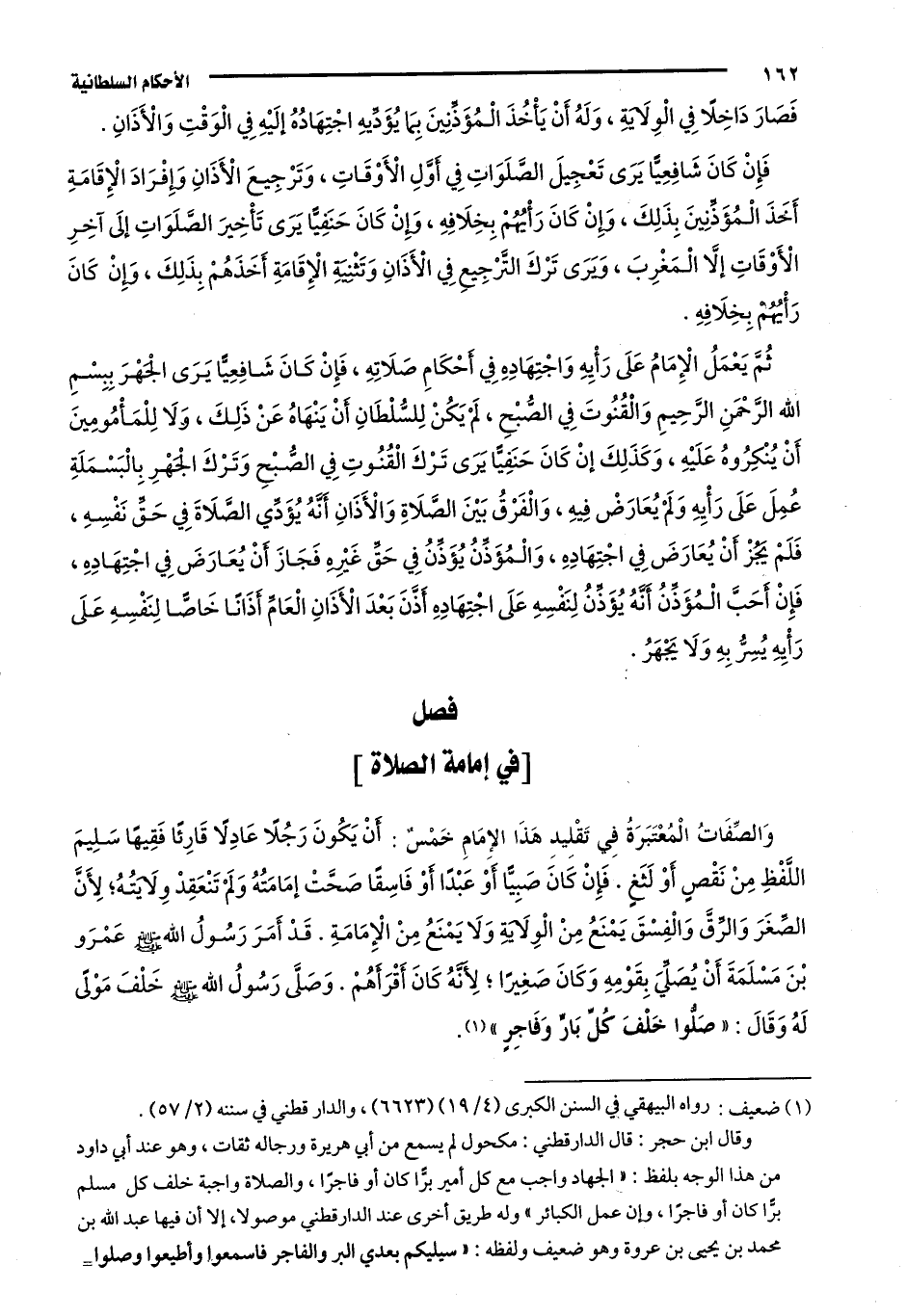 ثُمَّ يَعْمَلُ الْإِمَامُ عَلَى رَأْيِهِ وَاجْتِهَادِهِ فِي أَحْكَامِ صَلَاتِهِ، فَإِنْ كَانَ شَافِعِيًّا يَرَى الْجَهْرَ بِبِسْمِ اللَّهِ الرَّحْمَنِ الرَّحِيمِ وَالْقُنُوتَ فِي الصُّبْحِ، لَمْ يَكُنْ لِلسُّلْطَانِ أَنْ يَنْهَاهُ عَنْ ذَلِكَ، وَلَا لِلْمَأْمُومِينَ أَنْ يُنْكِرُوهُ عَلَيْهِ، وَكَذَلِكَ إنْ كَانَ حَنَفِيًّا يَرَى تَرْكَ الْقُنُوتِ فِي الصُّبْحِ وَتَرْكَ الْجَهْرِ بِالْبَسْمَلَةِ عُمِلَ عَلَى رَأْيِهِ وَلَمْ يُعَارَضْ فِيهِ، وَالْفَرْقُ بَيْنَ الصَّلَاةِ وَالْأَذَانِ أَنَّهُ يُؤَدِّي الصَّلَاةَ فِي حَقِّ نَفْسِهِ، فَلَمْ يَجُزْ أَنْ يُعَارَضَ فِي اجْتِهَادِهِ، وَالْمُؤَذِّنُ يُؤَذِّنُ فِي حَقِّ غَيْرِهِ، فَجَازَ أَنْ يُعَارَضَ فِي اجْتِهَادِهِ، فَإِنْ أَحَبَّ الْمُؤَذِّنُ أَنَّهُ يُؤَذِّنُ لِنَفْسِهِ عَلَى اجْتِهَادِهِ أَذَّنَ بَعْدَ الْأَذَانِ الْعَامِّ أَذَانًا خَاصًّا لِنَفْسِهِ عَلَى رَأْيِهِ يُسِرُّ بِهِ وَلَا يَجْهَرُ.