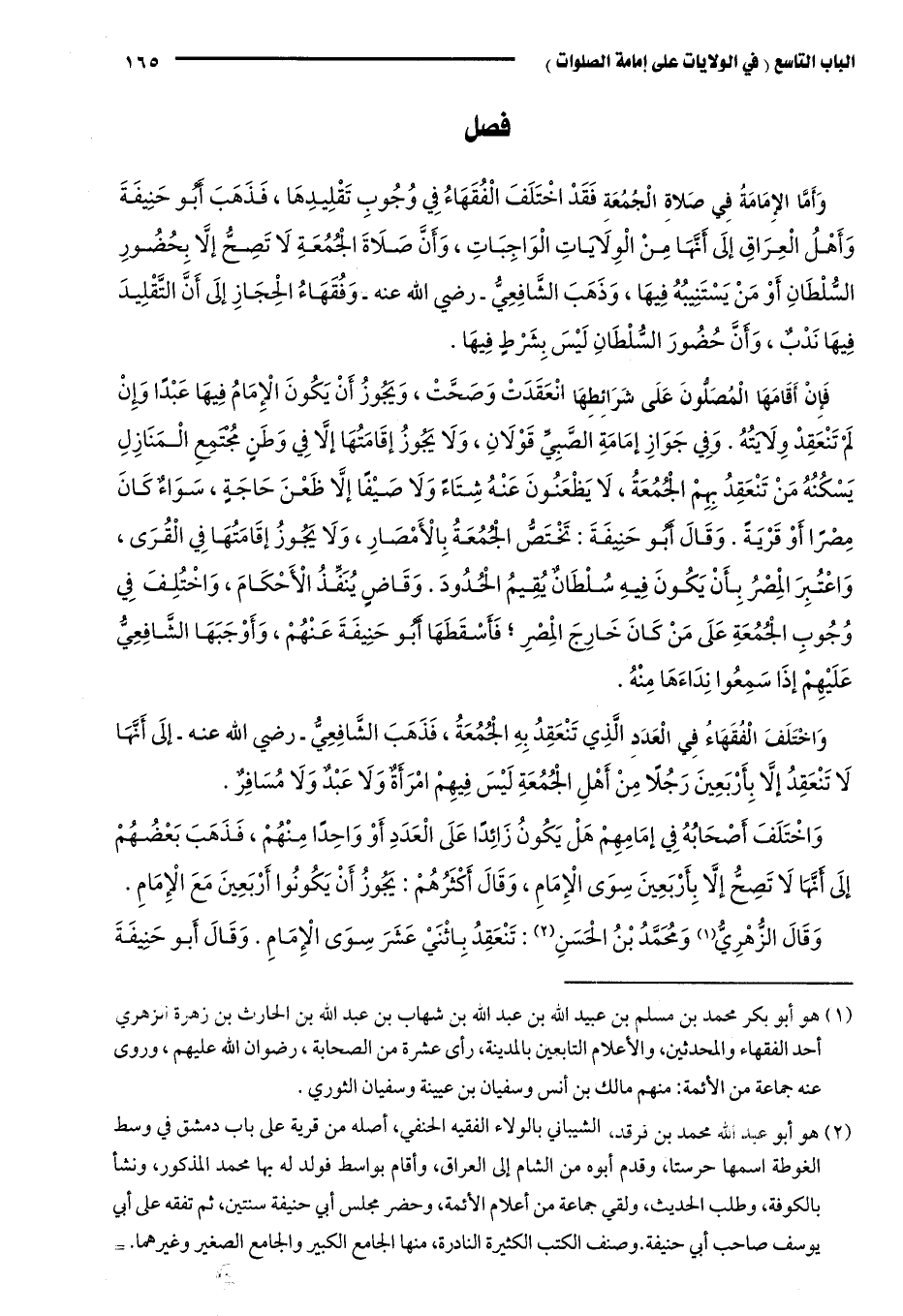 وَأَمَّا الْإِمَامَةُ فِي صَلَاةِ الْجُمُعَةِ فَقَدْ اخْتَلَفَ الْفُقَهَاءُ فِي وُجُوبِ تَقْلِيدِهَا، فَذَهَبَ أَبُو حَنِيفَةَ وَأَهْلُ الْعِرَاقِ إلَى أَنَّهَا مِنَ الْوِلَايَاتِ الْوَاجِبَاتِ، وَأَنَّ صَلَاةَ الْجُمُعَةِ لَا تَصِحُّ إلَّا بِحُضُورِ السُّلْطَانِ، أَوْ مَنْ يَسْتَنِيبُهُ فِيهَا، وَذَهَبَ الشَّافِعِيُّ -رَضِيَ اللَّهُ عَنْهُ، وَفُقَهَاءُ الْحِجَازِ إلَى أَنَّ التَّقْلِيدَ فِيهَا نَدْبٌ، وَأَنَّ حُضُورَ السُّلْطَانِ لَيْسَ بِشَرْطٍ فِيهَا.