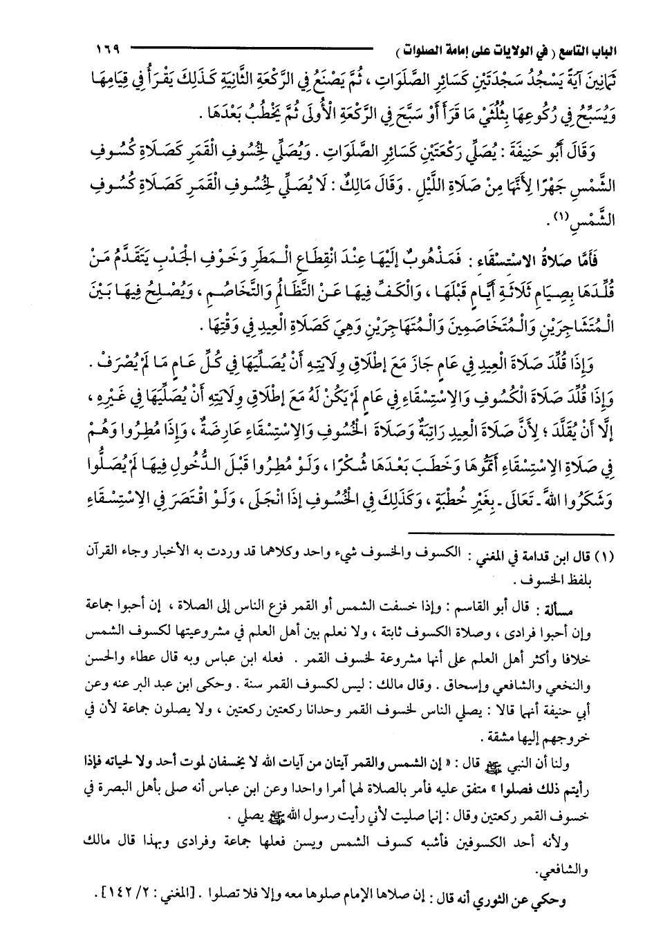 ولنا أنَّ النبي -صلى الله عليه وسلم- قال: "إن الشمس والقمر آيتان من آيات الله، لا يخسفان لموت أحد ولا لحياته، فإذا رأيتم ذلك فصلوا" متفق عليه، فأمر بالصلاة لهما أمرًا واحدًا، وعن ابن عباس أنَّه صلى بأهل البصرة في خسوف القمر ركعتين، وقال: إنما صليت لأنِّي رأيت رسول الله -صلى الله عليه وسلم- يصلي.