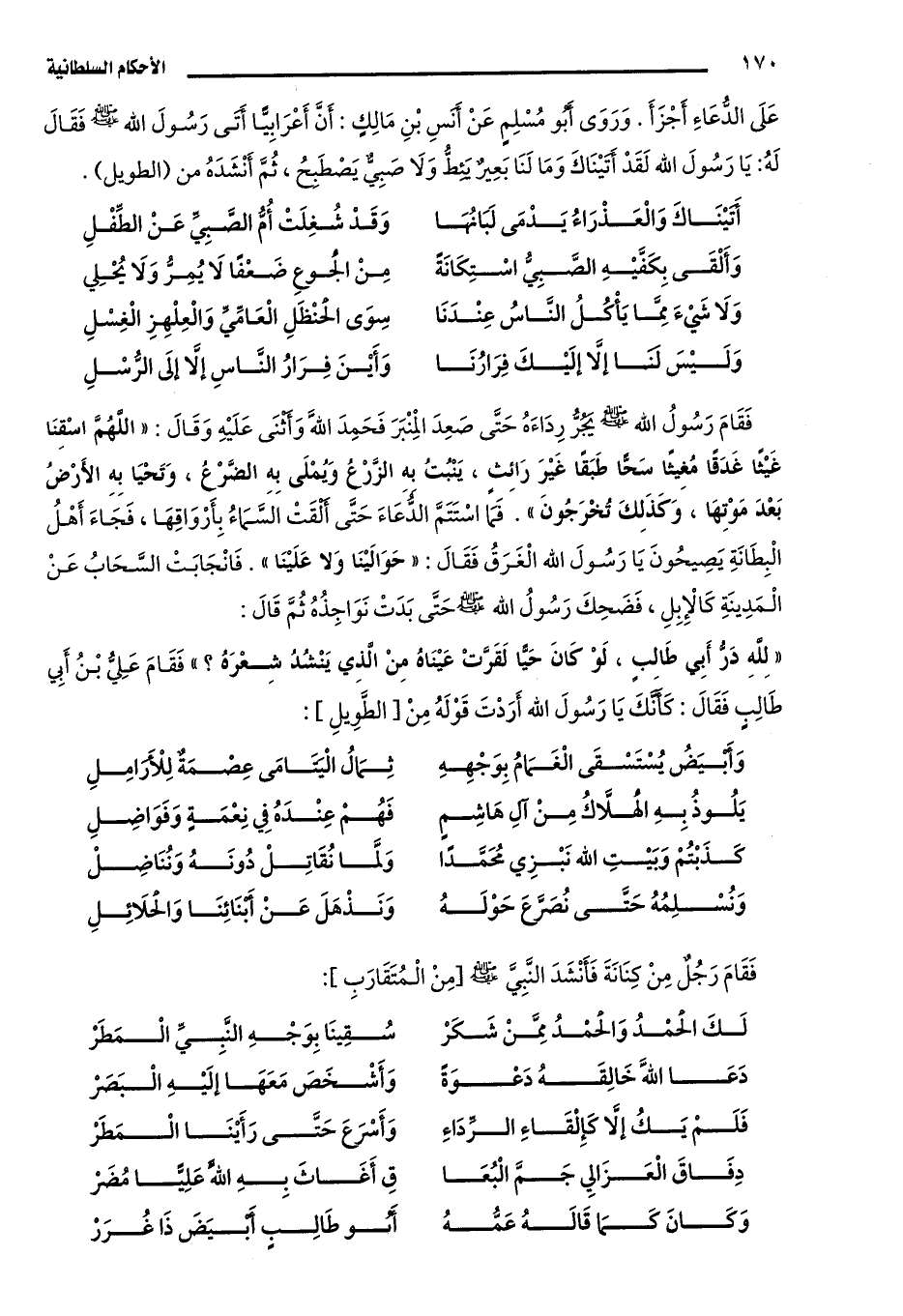 وَرَوَى أَبُو مُسْلِمٍ عَنْ أَنَسِ بْنِ مَالِكٍ: أَنَّ أَعْرَابِيًّا أَتَى رَسُولَ اللَّهِ -صَلَّى اللَّهُ عَلَيْهِ وَسَلَّمَ- فَقَالَ لَهُ: يَا رَسُولَ اللَّهِ، لَقَدْ أَتَيْنَاكَ وَمَا لَنَا بَعِيرٌ يَئِطُّ، وَلَا صَبِيٌّ يَصْطَبِحُ، ثُمَّ أَنْشَدَهُ من "الطويل":