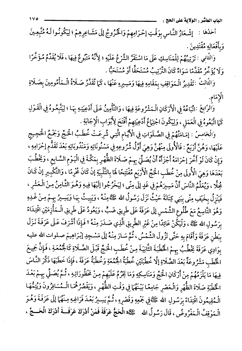 وَالْخَامِسُ: إمَامَتُهُمْ فِي الصَّلَوَاتِ فِي الْأَيَّامِ الَّتِي شُرِعَتْ خُطَبُ الْحَجِّ وَجَمْعُ الْحَجِيجِ عَلَيْهَا، وَهُنَّ أَرْبَعٌ: فَالْأُولَى مِنْهُنَّ وَهِيَ أَوَّلُ شُرُوعِهِ فِي مَسْنُونَاتِهِ وَمَنْدُوبَاتِهِ بَعْدَ تَقَدُّمِ إحْرَامِهِ، وَإِنْ كَانَ لَوْ أَخَّرَ إحْرَامَهُ أَجْزَأَهُ أَنْ يُصَلِّيَ بِهِمْ صَلَاةَ الظُّهْرِ بِمَكَّةَ فِي الْيَوْمِ السَّابِعِ، وَيَخْطُبَ بَعْدَهَا، وَهِيَ الْأُولَى مِنْ خُطَبِ الْحَجِّ الْأَرْبَعِ مُفْتَتِحًا لَهَا بِالتَّلْبِيَةِ إنْ كَانَ مُحْرِمًا، وَالتَّكْبِيرِ إنْ كَانَ مُحِلًّا، وَيُعَلِّمُ النَّاسَ أَنَّ مَسِيرَهُمْ فِي غَدٍ إلَى مِنًى؛ لِيَخْرُجُوا إلَيْهَا فِيهِ وَهُوَ الثَّامِنُ مِنَ الْعَشْرِ، فَيَنْزِلُ بِخَيْفِ مِنًى بِبَنِي كِنَانَةَ؛ حَيْثُ نَزَلَ رَسُولُ اللَّهِ -صَلَّى اللَّهُ عَلَيْهِ وَسَلَّمَ- مِنْهُ، وَيَبِيتُ بِهَا وَيَسِيرُ بِهِمْ مِنْ غَدِهِ وَهُوَ التَّاسِعُ مَعَ طُلُوعِ الشَّمْسِ إلَى عَرَفَةَ عَلَى طَرِيقِ ضَبٍّ، وَيَعُودُ عَلَى طَرِيقِ الْمَأْزِمَيْنِ اقْتِدَاءً بِرَسُولِ اللَّهِ -صَلَّى اللَّهُ عَلَيْهِ وَسَلَّمَ، وَلْيَكُنْ عَائِدًا مِنْ غَيْرِ الطَّرِيقِ الَّذِي صَدَرَ مِنْهُ؛ فَإِذَا أَشْرَفَ عَلَى عَرَفَةَ نَزَلَ بِبَطْنِ عَرَفَةَ وَأَقَامَ بِهِ حَتَّى تَزُولَ الشَّمْسُ، ثُمَّ سَارَ مِنْهُ إلَى مَسْجِدِ إبْرَاهِيمَ -صَلَوَاتُ اللَّهِ عَلَيْهِ- بِوَادِي عَرَفَةَ، يَخْطُبُ بِهِمْ الْخُطْبَةَ الثَّانِيَةَ مِنْ خُطَبِ الْحَجِّ قَبْلَ الصَّلَاةِ كَالْجُمُعَةِ، فَإِنَّ جَمِيعَ الْخُطَبِ مَشْرُوعَةٌ بَعْدَ الصَّلَاةِ إلَّا خُطْبَتَيْنِ: خُطْبَةُ الْجُمُعَةِ وَخُطْبَةُ عَرَفَةَ، فَإِذَا خَطَبَهَا ذَكَّرَ النَّاسَ فِيهَا مَا يَلْزَمُهُمْ مِنْ أَرْكَانِ الْحَجِّ وَمَنَاسِكِهِ، وَمَا يَحْرُمُ عَلَيْهِمْ مِنْ مَحْظُورَاتِهِ، ثُمَّ يُصَلِّي بِهِمْ بَعْدَ الْخُطْبَةِ صَلَاةَ الظُّهْرِ وَالْعَصْرِ جَامِعًا بَيْنَهُمَا فِي وَقْتِ الظُّهْرِ، وَيَقْصُرُهُمَا الْمُسَافِرُونَ وَيُتِمُّهَا الْمُقِيمُونَ اقْتِدَاءً بِرَسُولِ اللَّهِ -صَلَّى اللَّهُ عَلَيْهِ وَسَلَّمَ- فِي جَمْعِهِ وَقَصْرِهِ، ثُمَّ يَسِيرُ بَعْدَ فَرَاغِهِ مِنْهُمَا إلَى عَرَفَةَ وَهُوَ الْمَوْقِفُ الْمَفْرُوضُ، قَالَ رَسُولُ اللَّهِ -صَلَّى اللَّهُ عَلَيْهِ وَسَلَّمَ: "الْحَجُّ عَرَفَةَ، فَمَنْ أَدْرَكَ عَرَفَةَ أَدْرَكَ الْحَجَّ،