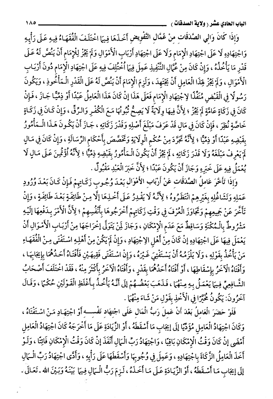 وَإِذَا كَانَ وَالِي الصَّدَقَاتِ مِنْ عُمَّالِ التَّفْوِيضِ أَخَذَهَا فِيمَا اخْتَلَفَ الْفُقَهَاءُ فِيهِ عَلَى رَأْيِهِ وَاجْتِهَادِهِ، لَا عَلَى اجْتِهَادِ الْإِمَامِ، وَلَا عَلَى اجْتِهَادِ أَرْبَابِ الْأَمْوَالِ، وَلَمْ يَجُزْ لِلْإِمَامِ أَنْ يَنُصَّ لَهُ عَلَى قَدْرِ مَا يَأْخُذُهُ، وَإِنْ كَانَ مِنْ عُمَّالِ التَّنْفِيذِ عَمِلَ فِيمَا اُخْتُلِفَ فِيهِ عَلَى اجْتِهَادِ الْإِمَامِ دُونَ أَرْبَابِ الْأَمْوَالِ، وَلَمْ يَجُزْ لِهَذَا الْعَامِلِ أَنْ يَجْتَهِدَ، وَلَزِمَ الْإِمَامَ أَنْ يَنُصَّ لَهُ عَلَى الْقَدْرِ الْمَأْخُوذِ، وَيَكُونَ رَسُولًا فِي الْقَبْضِ مُنَفِّذًا لِاجْتِهَادِ الْإِمَامِ، فَعَلَى هَذَا إنْ كَانَ هَذَا الْعَامِلُ عَبْدًا أَوْ ذِمِّيًّا جَازَ، فَإِنْ كَانَ فِي زَكَاةٍ عَامَّةٍ لَمْ يَجُزْ؛ لِأَنَّ فِيهَا وِلَايَةً لَا يَصِحُّ ثُبُوتُهَا مَعَ الْكُفْرِ وَالرِّقِّ، وَإِنْ كَانَ فِي زَكَاةٍ خَاصَّةٍ نُظِرَ، فَإِنْ كَانَ فِي مَالٍ قَدْ عَرَفَ مَبْلَغَ أَصْلِهِ وَقَدْرَ زَكَاتِهِ جَازَ أَنْ يَكُونَ هَذَا الْمَأْمُورُ بِقَبْضِهِ عَبْدًا أَوْ ذِمِّيًّا؛ لِأَنَّهُ تَجَرَّدَ مِنْ حُكْمِ الْوِلَايَةِ وَتَخَصَّصَ بِأَحْكَامِ الرِّسَالَةِ، وَإِنْ كَانَ فِي مَالٍ لَمْ يَعْرِفْ مَبْلَغَهُ وَلَا قَدْرَ زَكَاتِهِ، لَمْ يَجُزْ أَنْ يَكُونَ الْمَأْمُورُ بِقَبْضِهِ ذِمِّيًّا؛ لِأَنَّهُ اُؤْتُمِنَ عَلَى مَالٍ لَا يُعْمَلُ فِيهِ عَلَى خَبَرِهِ، وَجَازَ أَنْ يَكُونَ عَبْدًا؛ لِأَنَّ خَبَرَ الْعَبْدِ مَقْبُولٌ.