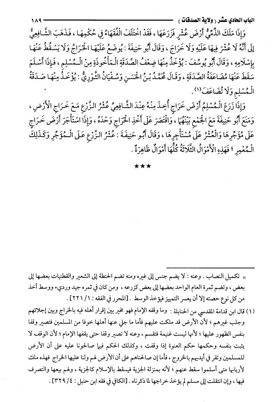 وَإِذَا مَلَكَ الذِّمِّيُّ أَرْضَ عُشْرٍ فَزَرَعَهَا، فَقَدْ اخْتَلَفَ الْفُقَهَاءُ فِي حُكْمِهَا، فَذَهَبَ الشَّافِعِيُّ إلَى أَنَّهُ لَا عُشْرَ فِيهَا عَلَيْهِ وَلَا خَرَاجَ، وَقَالَ أَبُو حَنِيفَةَ: يُوضَعُ عَلَيْهَا الْخَرَاجُ وَلَا يَسْقُطُ عَنْهَا بِإِسْلَامِهِ، وَقَالَ أَبُو يُوسُفَ: يُؤْخَذُ مِنْهَا ضِعْفُ الصَّدَقَةِ الْمَأْخُوذَةِ مِنَ الْمُسْلِمِ، فَإِذَا أَسْلَمَ سَقَطَ عَنْهَا مُضَاعَفَةُ الصَّدَقَةِ، وَقَالَ مُحَمَّدُ بْنُ الْحَسَنِ وَسُفْيَانُ الثَّوْرِيُّ: يُؤْخَذُ مِنْهَا صَدَقَةُ الْمُسْلِمِ وَلَا تُضَاعَفَ1.