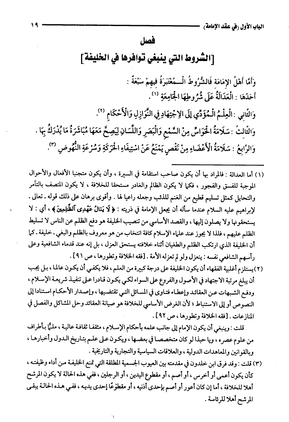 2 يستلزم أغلبية الفقهاء أن يكون الخليفة على درجة كبيرة من العلم، فلا يكفي أن يكون عالمًا، بل يجب أن يبلغ مرتبة الاجتهاد في الأصول والفروع على السواء؛ لكي يكون قادرًا على تنفيذ شريعة الإسلام، ودفع الشبهات عن العقائد، وإعطاء فتاوى في المسائل التي تقتضيها، وإصدار الأحكام استنادًا إلى النصوص أو إلى الاستنباط؛ لأن الغرض الأساسي للخلافة هو صيانة العقائد وحل المشاكل والفصل في المنازعات. "فقه الخلافة وتطورها، ص 92".