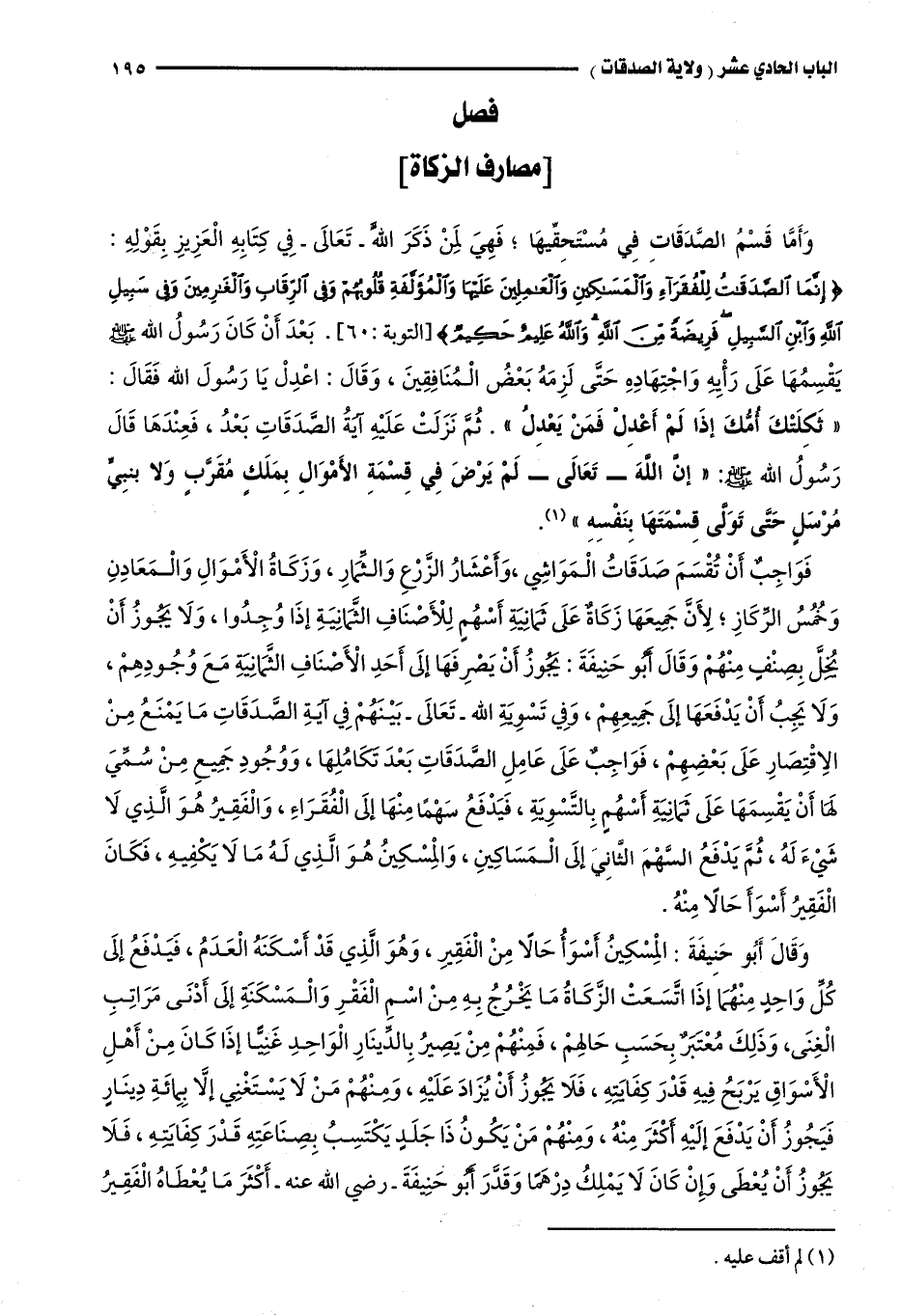 وَأَمَّا قَسْمُ الصَّدَقَاتِ فِي مُسْتَحِقِّيهَا؛ فَهِيَ لِمَنْ ذَكَرَ اللَّهُ تَعَالَى فِي كِتَابِهِ الْعَزِيزِ بِقَوْلِهِ: {إنَّمَا الصَّدَقَاتُ لِلْفُقَرَاءِ وَالْمَسَاكِينِ وَالْعَامِلِينَ عَلَيْهَا وَالْمُؤَلَّفَةِ قُلُوبُهُمْ وَفِي الرِّقَابِ وَالْغَارِمِينَ وَفِي سَبِيلِ اللَّهِ وَابْنِ السَّبِيلِ فَرِيضَةً مِنْ اللَّهِ وَاَللَّهُ عَلِيمٌ حَكِيمٌ} [التوبة: 60] . بَعْدَ أَنْ كَانَ رَسُولُ اللَّهِ -صَلَّى اللَّهُ عَلَيْهِ وَسَلَّمَ- يَقْسِمُهَا عَلَى رَأْيِهِ وَاجْتِهَادِهِ، حَتَّى لَزِمَهُ بَعْضُ الْمُنَافِقِينَ وَقَالَ: اعْدِلْ يَا رَسُولَ اللَّهِ، فَقَالَ: "ثَكِلَتْكَ أُمُّكَ، إذَا لَمْ أَعْدِلْ فَمَنْ يَعْدِلُ".