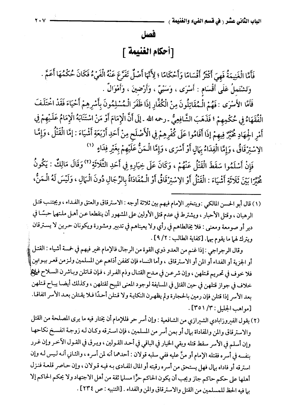 2 يقول الفيروزابادي الشيرازي من الشافعية: وإن أسر حرّ فللإمام أن يختار فيه ما يرى المصلحة من القتل والاسترقاق والمن والمفاداة بمال أو بمن أسر من المسلمين، فإن استرقَّه وكان له زوجة انفسخ نكاحها، وإن أسلم في الأسر سقط قتله، وبقي الخيار في الباقي في أحد القولين، ويرقّ في القول الآخر، وإن غرر بنفسه في أسره فقتله الإمام أو من عليه ففي سلبه قولان: أحدهما أنه لمن أسره، والثاني أنه ليس له، وإن استرقه أو فاداه بمال فهل يستحق من أسره رقبته، أو المال المفادى به فيه قولان، وإن حاصر قلعة فنزل أهلها على حكم حاكم جاز، ويجب أن يكون الحاكم حرًّا مسلمًا ثقة من أهل الاجتهاد ولا يحكم الحاكم إلّا بما فيه الحظ للمسلمين منَ القتل والاسترقاق والمنّ والفداء. [التنبيه: ص 234] .