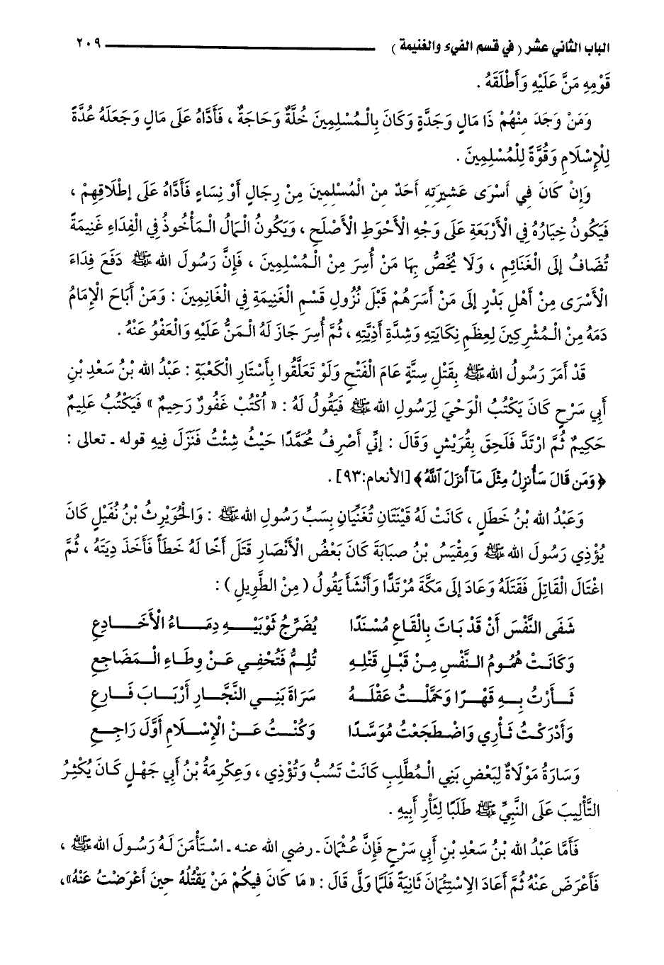 وَعَبْدُ اللَّهِ بْنُ خَطَلٍ، كَانَتْ لَهُ قَيْنَتَانِ تُغَنِّيَانِ بِسَبِّ رَسُولِ اللَّهِ -صَلَّى اللَّهُ عَلَيْهِ وَسَلَّمَ، وَالْحُوَيْرِثُ بْنُ نُفَيْلٍ، كَانَ يُؤْذِي رَسُولَ اللَّهِ -صَلَّى اللَّهُ عَلَيْهِ وَسَلَّمَ، وَمِقْيَسُ بْنُ حُبَابَةَ، كَانَ بَعْضُ الْأَنْصَارِ قَتَلَ أَخًا لَهُ خَطَأً فَأَخَذَ دِيَتَهُ ثُمَّ اغْتَالَ الْقَاتِلَ فَقَتَلَهُ، وَعَادَ إلَى مَكَّةَ مُرْتَدًّا وَأَنْشَأَ يَقُولُ "مِنَ الطَّوِيلِ":