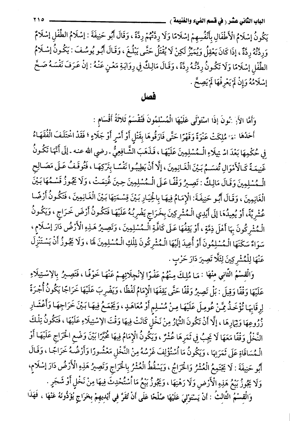 أَحَدُهَا: مَا مُلِكَتْ عَنْوَةً وَقَهْرًا حَتَّى فَارَقُوهَا بِقَتْلٍ أَوْ أَسْرٍ أَوْ جَلَاءٍ؛ فَقَدْ اخْتَلَفَ الْفُقَهَاءُ فِي حُكْمِهَا بَعْدَ اسْتِيلَاءِ الْمُسْلِمِينَ عَلَيْهَا، فَذَهَبَ الشَّافِعِيُّ -رَضِيَ اللَّهُ عَنْهُ- إلَى أَنَّهَا تَكُونُ غَنِيمَةً كَالْأَمْوَالِ تُقْسَمُ بَيْنَ الْغَانِمِينَ، إلَّا أَنْ يَطِيبُوا نَفْسًا بِتَرْكِهَا، فَتُوقَفُ عَلَى مَصَالِحِ الْمُسْلِمِينَ، وَقَالَ مَالِكٌ: تَصِيرُ وَقْفًا عَلَى الْمُسْلِمِينَ حِينَ غُنِمَتْ، وَلَا يَجُوزُ قَسْمُهَا بَيْنَ الْغَانِمِينَ، وَقَالَ أَبُو حَنِيفَةَ: الْإِمَامُ فِيهَا بِالْخِيَارِ بَيْنَ قِسْمَتِهَا بَيْنَ الْغَانِمِينَ، فَتَكُونُ أَرْضًا عُشْرِيَّةً، أَوْ يُعِيدُهَا إلَى أَيْدِي الْمُشْرِكِينَ بِخَرَاجٍ يَضْرِبُهُ عَلَيْهَا فَتَكُونُ أَرْضَ خَرَاجٍ، وَيَكُونُ الْمُشْرِكُونَ بِهَا أَهْلَ ذِمَّةٍ، أَوْ يَقِفُهَا عَلَى كَافَّةِ الْمُسْلِمِينَ، وَتَصِيرُ هَذِهِ الْأَرْضُ دَارَ إسْلَامٍ، سَوَاءٌ سَكَنَهَا الْمُسْلِمُونَ أَوْ أُعِيدَ إلَيْهَا الْمُشْرِكُونَ لِمِلْكِ الْمُسْلِمِينَ لَهَا، وَلَا يَجُوزُ أَنْ يَسْتَنْزِلَ عَنْهَا لِلْمُشْرِكِينَ لِئَلَّا تَصِيرَ دَارَ حَرْبٍ.