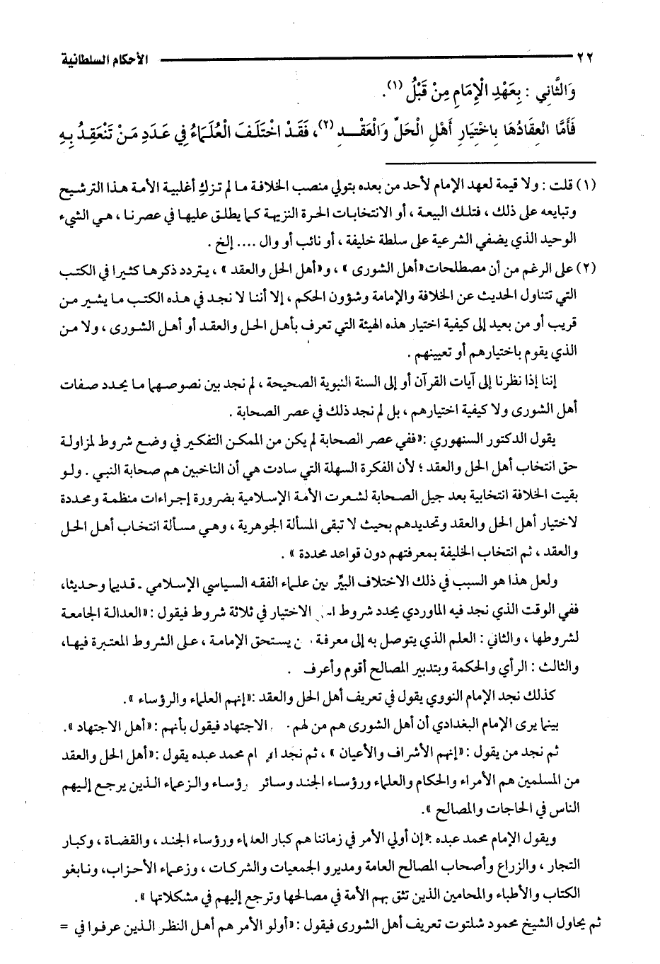 2 على الرَّغم من أنَّ مصطلحات "أهل الشورى"، و"أهل الحل والعقد"، يتردَّد ذكرها كثيرًا في الكتب التي تتناول الحديث عن الخلافة والإمامة وشئون الحكم، إلَّا أننا لا نجد في هذه الكتب ما يشير من قريبٍ أو من بعيد إلى كيفيَّة اختيار هذه الهيئة التي تُعْرَف بأهلِ الحلِّ والعقد أو أهل الشورى، ولا من الذي يقوم باختيارهم أو تعيينهم.