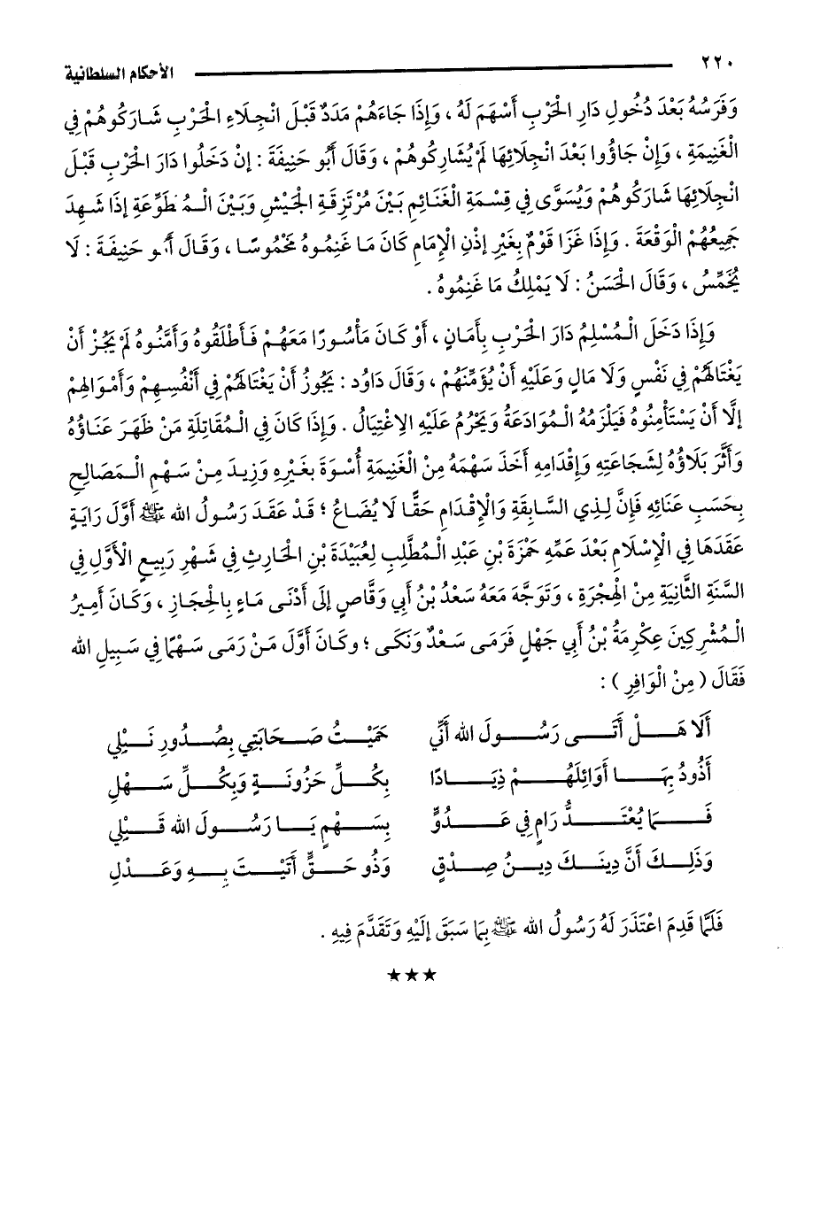 وَإِذَا كَانَ فِي الْمُقَاتِلَةِ مَنْ ظَهَرَ عَنَاؤُهُ وَأَثَّرَ بَلَاؤُهُ لِشَجَاعَتِهِ وَإِقْدَامِهِ أَخَذَ سَهْمَهُ مِنَ الْغَنِيمَةِ أُسْوَةَ غَيْرِهِ، وَزِيدَ مِنْ سَهْمِ الْمَصَالِحِ بِحَسَبِ عَنَائِهِ، فَإِنَّ لِذِي السَّابِقَةِ وَالْإِقْدَامِ حَقًّا لَا يُضَاعُ؛ قَدْ عَقَدَ رَسُولُ اللَّهِ -صَلَّى اللَّهُ عَلَيْهِ وَسَلَّمَ- أَوَّلَ رَايَةٍ عَقَدَهَا فِي الْإِسْلَامِ بَعْدَ عَمِّهِ حَمْزَةَ بْنِ عَبْدِ الْمُطَّلِبِ لِعُبَيْدَةَ بْنِ الْحَارِثِ فِي شَهْرِ رَبِيعٍ الْأَوَّلِ فِي السَّنَةِ الثَّانِيَةِ مِنَ الْهِجْرَةِ، وَتَوَجَّهَ مَعَهُ سَعْدُ بْنُ أَبِي وَقَّاصٍ إلَى أَدْنَى مَاءٍ بِالْحِجَازِ، وَكَانَ أَمِيرُ الْمُشْرِكِينَ عِكْرِمَةُ بْنُ أَبِي جَهْلٍ فَرَمَى سَعْدٌ وَنَكَى؛ كَانَ أَوَّلَ مَنْ رَمَى سَهْمًا فِي سَبِيلِ اللَّهِ فَقَالَ "مِنَ الْوَافِرِ":