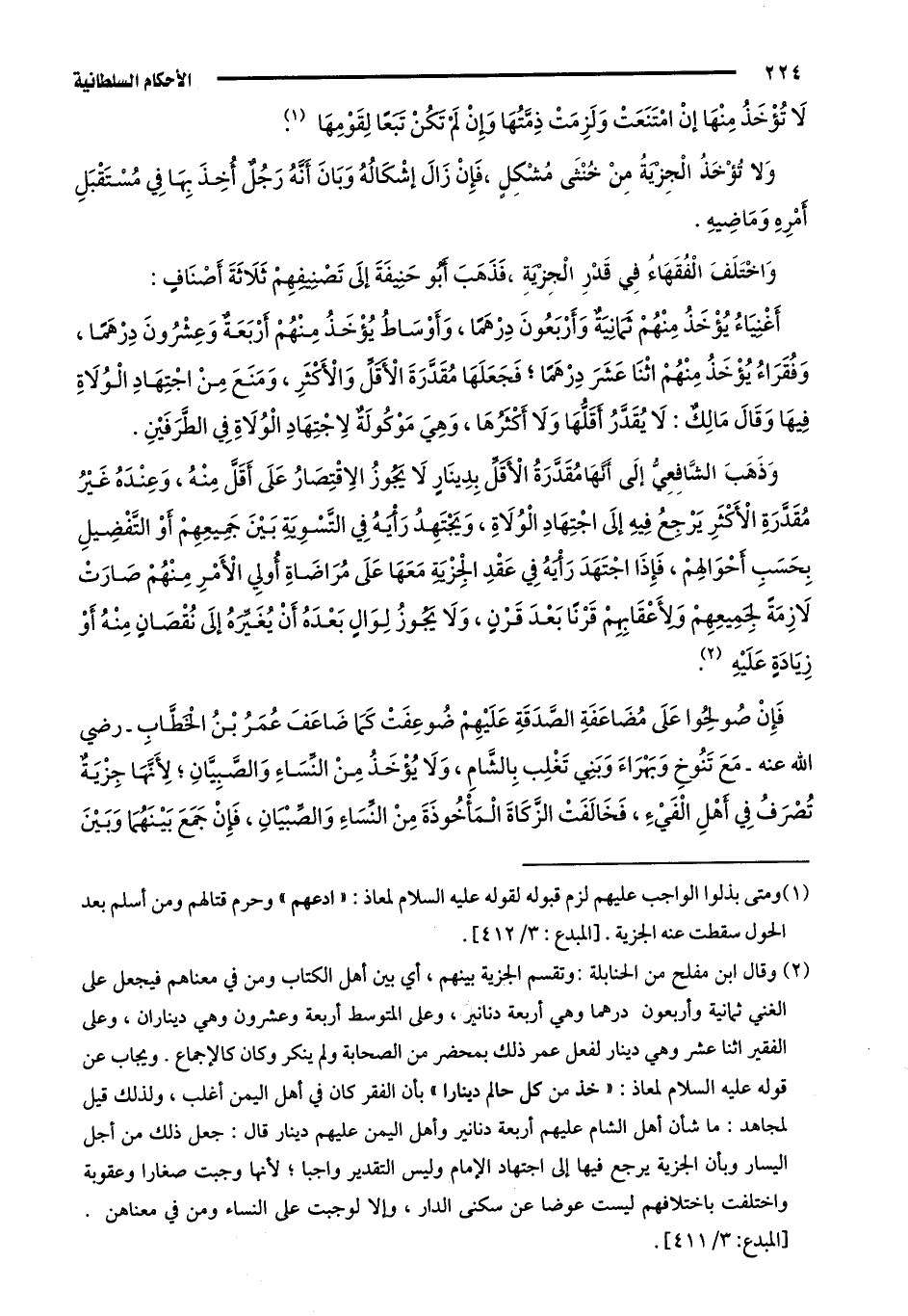 2 وقال ابن مفلح من الحنابلة: وتقسم الجزية بينهم، أي: بين أهل الكتاب ومن في معناهم، فيجعل على الغني ثمانية وأربعون درهمًا وهي أربعة دنانير، وعلى المتوسط أربعة وعشرون وهي ديناران، وعلى الفقير اثنا عشر وهي دينار؛ لفعل عمر ذلك بمحضر من الصحابة ولم ينكر وكان كالإجماع، ويجاب عن قوله -عليه السلام- لمعاذ: "خذ من كل حالم دينارًا" بأنّ الفقر كان في أهل اليمن أغلب، ولذلك قيل لمجاهد: ما شأن أهل الشام عليهم أربعة دنانير وأهل اليمن عليهم دينار، قال: جعل ذلك من أجل اليسار، وبأنَّ الجزية يرجع فيها إلى اجتهاد الإمام وليس التقدير واجبًا؛ لأنها وجبت صغارًا وعقوبة، واختلفت باختلافهم ليست عوضًا عن سكنى الدار، وإلّا لوجبت على النساء ومن في معناهن. [المبدع: 3/ 411] .