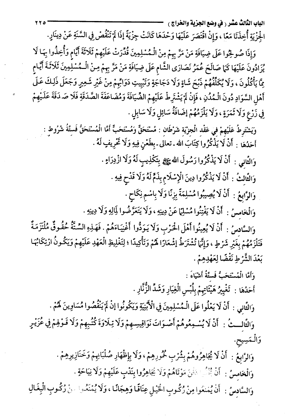 وَيَشْتَرِطُ عَلَيْهِمْ فِي عَقْدِ الْجِزْيَةِ شَرْطَانِ: مُسْتَحَقٌّ وَمُسْتَحَبٌّ، أَمَّا الْمُسْتَحَقُّ فَسِتَّةُ شُرُوطٍ: