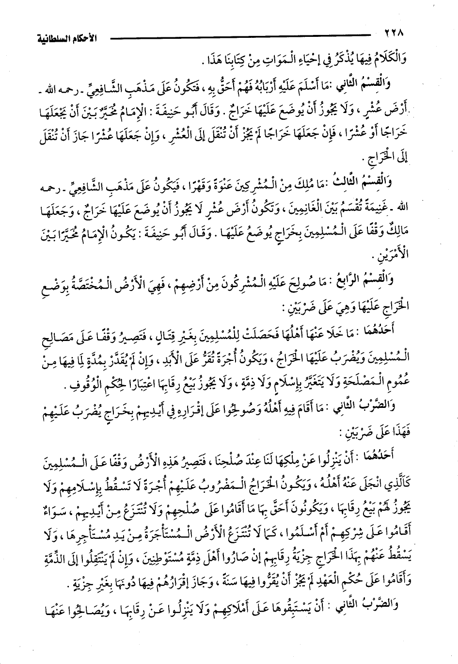 أَحَدُهُمَا: أَنْ يَنْزِلُوا عَنْ مِلْكِهَا لَنَا عِنْدَ صُلْحِنَا، فَتَصِيرُ هَذِهِ الْأَرْضُ وَقْفًا عَلَى الْمُسْلِمِينَ كَاَلَّذِي انْجَلَى عَنْهُ أَهْلُهُ، وَيَكُونُ الْخَرَاجُ الْمَضْرُوبُ عَلَيْهِمْ أُجْرَةً لَا تَسْقُطُ بِإِسْلَامِهِمْ، وَلَا يَجُوزُ لَهُمْ بَيْعُ رِقَابِهَا، وَيَكُونُونَ أَحَقَّ بِهَا مَا أَقَامُوا عَلَى صُلْحِهِمْ، وَلَا تُنْتَزَعُ مِنْ أَيْدِيهِمْ، سَوَاءٌ أَقَامُوا عَلَى شِرْكِهِمْ أَمْ أَسْلَمُوا، كَمَا لَا تُنْتَزَعُ الْأَرْضُ الْمُسْتَأْجَرَةُ مِنْ يَدِ مُسْتَأْجِرِهَا، وَلَا يَسْقُطُ عَنْهُمْ بِهَذَا الْخَرَاجِ جِزْيَةُ رِقَابِهِمْ إنْ صَارُوا أَهْلَ ذِمَّةٍ مُسْتَوْطِنِينَ، وَإِنْ لَمْ يَنْتَقِلُوا إلَى الذِّمَّةِ، وَأَقَامُوا عَلَى حُكْمِ الْعَهْدِ لَمْ يَجُزْ أَنْ يُقَرُّوا فِيهَا سَنَةً، وَجَازَ إقْرَارُهُمْ فِيهَا دُونَهَا بِغَيْرِ جِزْيَةٍ.