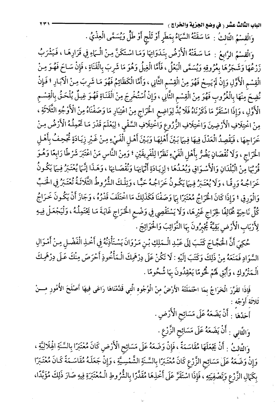 وَالْقِسْمُ الرَّابِعُ: مَا سَقَتْهُ الْأَرْضُ بِنَدَوَاتِهَا، وَمَا اسْتَكَنَّ مِنَ الْمَاءِ فِي قَرَارِهَا، فَيَشْرَبُ زَرْعُهَا وَشَجَرُهَا بِعُرُوقِهِ، وَيُسَمَّى الْبَعْلُ، فَأَمَّا الْغِيلُ وَهُوَ مَا شَرِبَ بِالْقَنَاةِ، فَإِنْ سَاحَ فَهُوَ مِنَ الْقِسْمِ الْأَوَّلِ، وَإِنْ لَمْ يَسِحْ فَهُوَ مِنَ الْقِسْمِ الثَّانِي، وَأَمَّا الْكَظَائِمُ فَهُوَ مَا شَرِبَ مِنَ الْآبَارِ؛ فَإِنْ نُضِحَ مِنْهَا بِالْغُرُوبِ فَهُوَ مِنَ الْقِسْمِ الثَّانِي، وَإِنْ اُسْتُخْرِجَ مِنَ الْقَنَاةِ فَهُوَ غِيلٌ يُلْحَقُ بِالْقِسْمِ الْأَوَّلِ، وَإِذَا اسْتَقَرَّ مَا ذَكَرْنَاهُ فَلَا بُدَّ لِوَاضِعِ الْخَرَاجِ مِنِ اعْتِبَارِ مَا وَصَفْنَاهُ مِنَ الْأَوْجُهِ الثَّلَاثَةِ، مِنِ اخْتِلَافِ الْأَرْضِينَ وَاخْتِلَافِ الزُّرُوعِ وَاخْتِلَافِ السَّقْيِ؛ لِيَعْلَمَ قَدْرَ مَا تَحْمِلُهُ الْأَرْضُ مِنْ خَرَاجِهَا، فَيَقْصِدُ الْعَدْلَ فِيهَا فِيمَا بَيْنَ أَهْلِهَا وَبَيْنَ أَهْلِ الْفَيْءِ مِنْ غَيْرِ زِيَادَةٍ تُجْحِفُ بِأَهْلِ الْخَرَاجِ، وَلَا نُقْصَانٍ يَضُرُّ بِأَهْلِ الْفَيْءِ نَظَرًا لِلْفَرِيقَيْنِ؛ وَمِنَ النَّاسِ مَنِ اعْتَبَرَ شَرْطًا رَابِعًا وَهُوَ قُرْبُهَا مِنَ الْبُلْدَانِ وَالْأَسْوَاقِ وَبُعْدُهَا؛ لِزِيَادَةِ أَثْمَانِهَا وَنُقْصَانِهَا، وَهَذَا إنَّمَا يُعْتَبَرُ فِيمَا يَكُونُ خَرَاجُهُ وَرِقًا، وَلَا يُعْتَبَرُ فِيمَا يَكُونُ خَرَاجُهُ حَبًّا، وَتِلْكَ الشُّرُوطُ الثَّلَاثَةُ تُعْتَبَرُ فِي الْحَبِّ وَالْوَرِقِ؛ وَإِذَا كَانَ الْخَرَاجُ مُعْتَبَرًا بِمَا وَصَفْنَا، فَكَذَلِكَ مَا اخْتَلَفَ قَدْرُهُ، وَجَازَ أَنْ يَكُونَ خَرَاجُ كُلِّ نَاحِيَةٍ مُخَالِفًا لِخَرَاجِ غَيْرِهَا، وَلَا يَسْتَقْصِي فِي وَضْعِ الْخَرَاجِ غَايَةَ مَا يَحْتَمِلُهُ، وَلْيَجْعَلْ فِيهِ لِأَرْبَابِ الْأَرْضِ بَقِيَّةً يُجْبِرُونَ بِهَا النَّوَائِبَ وَالْحَوَائِجَ.