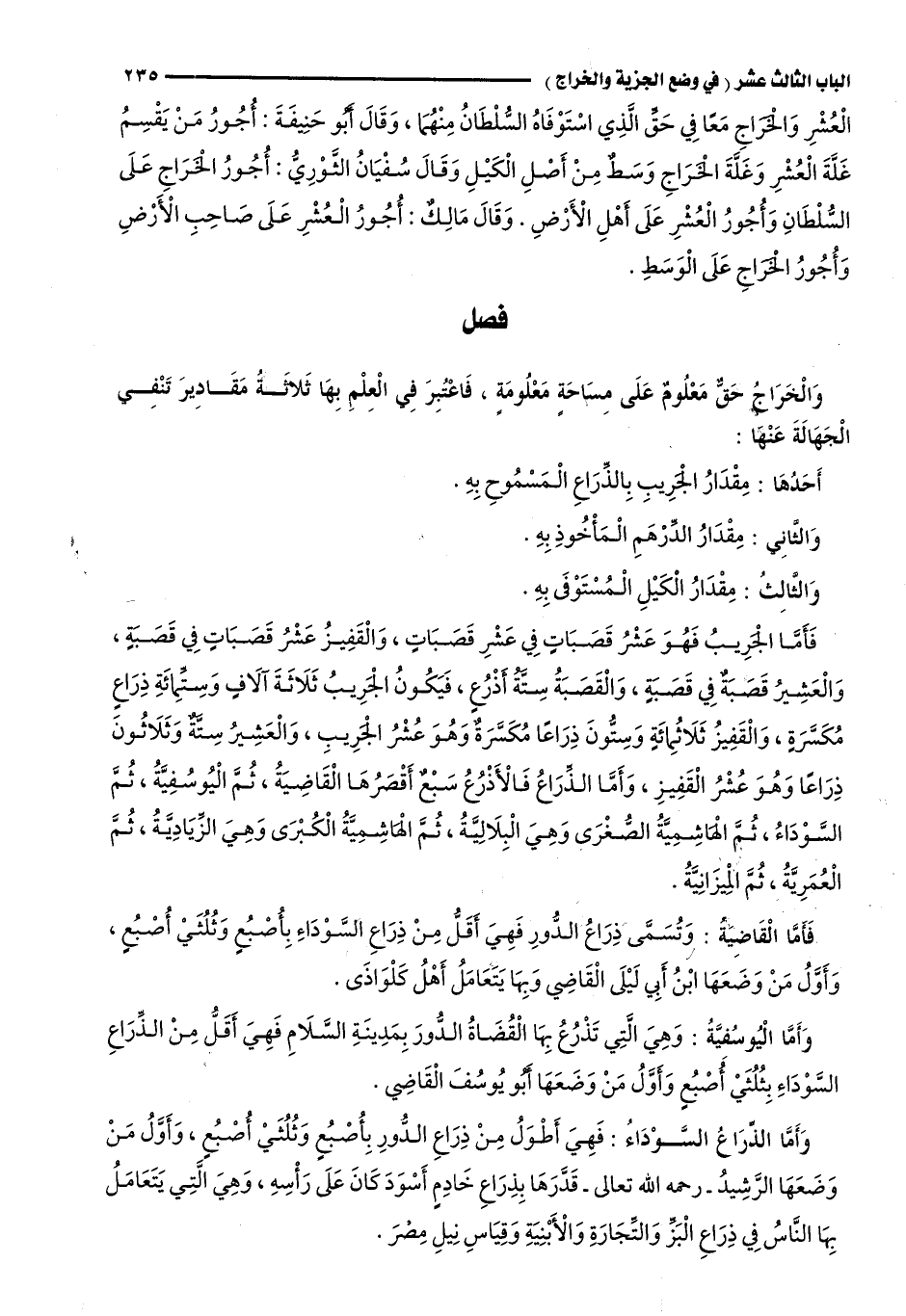 فَأَمَّا الْجَرِيبُ فَهُوَ عَشْرُ قَصَبَاتٍ فِي عَشْرِ قَصَبَاتٍ، وَالْقَفِيزُ عَشْرُ قَصَبَاتٍ فِي قَصَبَةٍ، وَالْعَشِيرُ قَصَبَةٌ فِي قَصَبَةٍ، وَالْقَصَبَةُ سِتَّةُ أَذْرُعٍ، فَيَكُونُ الْجَرِيبُ ثَلَاثَةَ آلَافٍ وَسِتِّمِائَةِ ذِرَاعٍ مُكَسَّرَةٍ، وَالْقَفِيزُ ثَلَاثُمِائَةٍ وَسِتُّونَ ذِرَاعًا مُكَسَّرَةٌ وَهُوَ عُشْرُ الْجَرِيبِ، وَالْعَشِيرُ سِتَّةٌ وَثَلَاثُونَ ذِرَاعًا وَهُوَ عُشْرُ الْقَفِيزِ، وَأَمَّا الذِّرَاعُ فَالْأَذْرُعُ سَبْعٌ أَقْصَرُهَا الْقَاضِيَةُ، ثُمَّ الْيُوسُفِيَّةُ ثُمَّ السَّوْدَاءُ، ثُمَّ الْهَاشِمِيَّةُ الصُّغْرَى وَهِيَ الْبِلَالِيَّةُ، ثُمَّ الْهَاشِمِيَّةُ الْكُبْرَى وَهِيَ الزِّيَادِيَّةُ، ثُمَّ الْعُمَرِيَّةُ، ثُمَّ الْمِيزَانِيَّةُ.