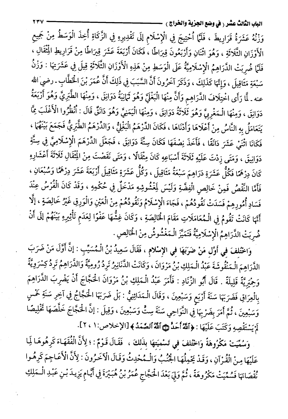 وَاخْتُلِفَ فِي أَوَّلِ مَنْ ضَرَبَهَا فِي الْإِسْلَامِ، فَقَالَ سَعِيدُ بْنُ الْمُسَيِّبِ: إنَّ أَوَّلَ مَنْ ضَرَبَ الدَّرَاهِمَ الْمَنْقُوشَةَ عَبْدُ الْمَلِكِ بْنُ مَرْوَانَ، وَكَانَتْ الدَّنَانِيرُ تَرِدُ رُومِيَّةً وَالدَّرَاهِمُ تَرِدُ كِسْرَوِيَّةً وَحِمْيَرِيَّةً قَلِيلَةً، قَالَ أَبُو الزِّنَادِ: فَأَمَرَ عَبْدُ الْمَلِكِ بْنُ مَرْوَانَ الْحَجَّاجَ أَنْ يَضْرِبَ الدَّرَاهِمَ بِالْعِرَاقِ، فَضَرَبَهَا سَنَةَ أَرْبَعٍ وَسَبْعِينَ، وَقَالَ الْمَدَائِنِيُّ: بَلْ ضَرَبَهَا الْحَجَّاجُ فِي آخِرِ سَنَةِ خَمْسٍ وَسَبْعِينَ، ثُمَّ أَمَرَ بِضَرْبِهَا فِي النَّوَاحِي سَنَةَ سِتٍّ وَسَبْعِينَ، وَقِيلَ: إنَّ الْحَجَّاجَ خَلَّصَهَا تَخْلِيصًا لَمْ يَسْتَقْصِهِ وَكَتَبَ عَلَيْهَا {اللَّهُ أَحَدٌ، اللَّهُ الصَّمَدُ} [الأخلاص: 1، 2] .
