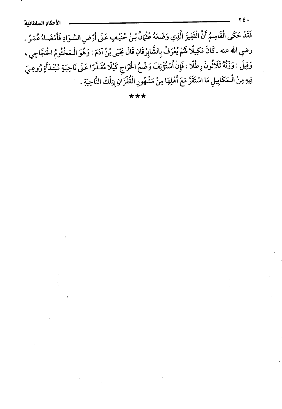 فَقَدْ حَكَى الْقَاسِمُ أَنَّ الْقَفِيزَ الَّذِي وَضَعَهُ عُثْمَانُ بْنُ حُنَيْفٍ عَلَى أَرْضِ السَّوَادِ فَأَمْضَاهُ عُمَرُ -رَضِيَ اللَّهُ عَنْهُ- كَانَ مَكِيلًا لَهُمْ يُعْرَفُ بِالشَّابِرْقَانِ، قَالَ يَحْيَى بْنُ آدَمَ: وَهُوَ الْمَخْتُومُ الْحَجَّاجِي، وَقِيلَ: وَزْنُهُ ثَلَاثُونَ رِطْلًا، فَإِنْ اُسْتُؤْنِفَ وَضْعُ الْخَرَاجِ كَيْلًا مُقَدَّرًا عَلَى نَاحِيَةٍ مُبْتَدَأَةٍ رُوعِيَ فِيهِ مِنَ الْمَكَايِيلِ مَا اسْتَقَرَّ مَعَ أَهْلِهَا مِنْ مَشْهُورِ الْقُفْزَانِ بِتِلْكَ النَّاحِيَةِ.