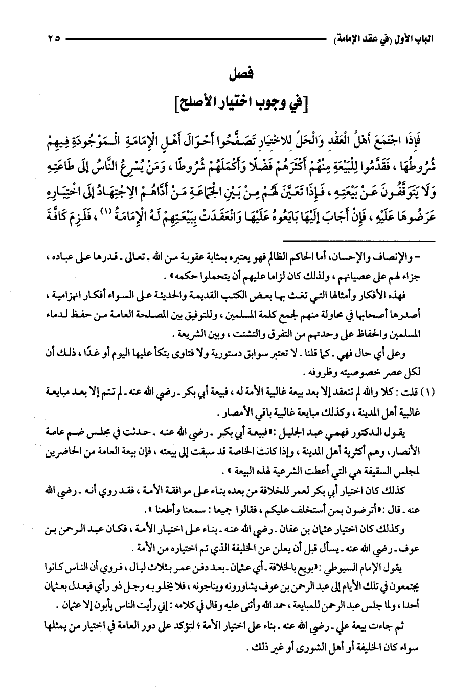 فَإِذَا اجْتَمَعَ أَهْلُ الْعَقْدِ وَالْحَلِّ لِلِاخْتِيَارِ تَصَفَّحُوا أَحْوَالَ أَهْلِ الْإِمَامَةِ الْمَوْجُودَةِ فِيهِمْ شُرُوطُهَا، فَقَدَّمُوا لِلْبَيْعَةِ مِنْهُمْ أَكْثَرَهُمْ فَضْلًا وَأَكْمَلَهُمْ شُرُوطًا، وَمَنْ يُسْرِعُ النَّاسُ إلَى طَاعَتِهِ، وَلَا يَتَوَقَّفُونَ عَنْ بَيْعَتِهِ، فَإِذَا تَعَيَّنَ لَهُمْ مِنْ بَيْنِ الْجَمَاعَةِ مَنْ أَدَّاهُمْ الِاجْتِهَادُ إلَى اخْتِيَارِهِ عَرَضُوهَا عَلَيْهِ، فَإِنْ أَجَابَ إلَيْهَا بَايَعُوهُ عَلَيْهَا، وَانْعَقَدَتْ بِبَيْعَتِهِمْ لَهُ الْإِمَامَةُ1، فَلَزِمَ كَافَّةَ
