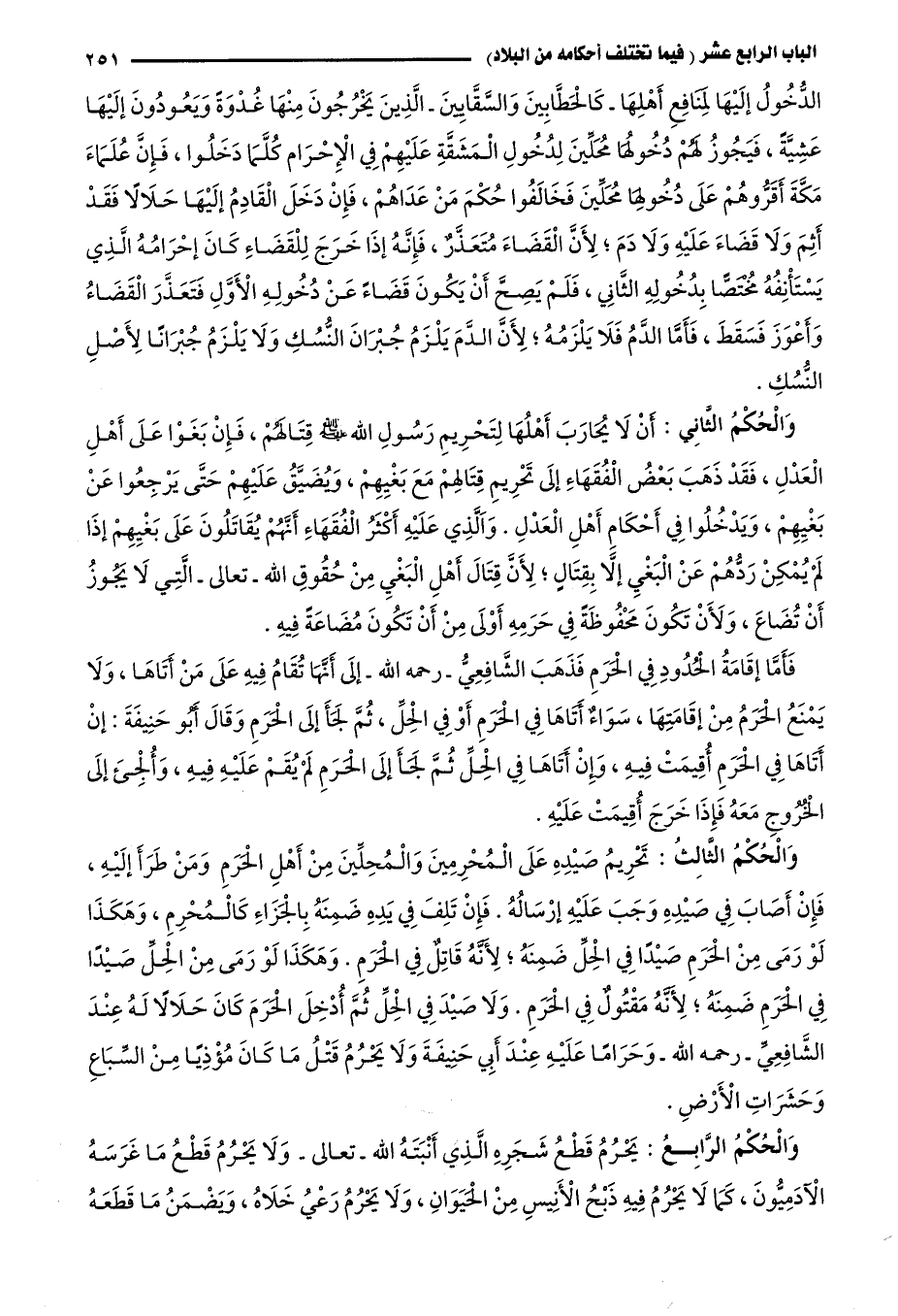 وَالْحُكْمُ الرَّابِعُ: يَحْرُمُ قَطْعُ شَجَرِهِ الَّذِي أَنْبَتَهُ اللَّهُ تعالى، وَلَا يَحْرُمُ قَطْعُ مَا غَرَسَهُ الْآدَمِيُّونَ، كَمَا لَا يَحْرُمُ فِيهِ ذَبْحُ الْأَنِيسِ مِنَ الْحَيَوَانِ، وَلَا يَحْرُمُ رَعْيُ خَلَاهُ، وَيَضْمَنُ مَا قَطَعَهُ