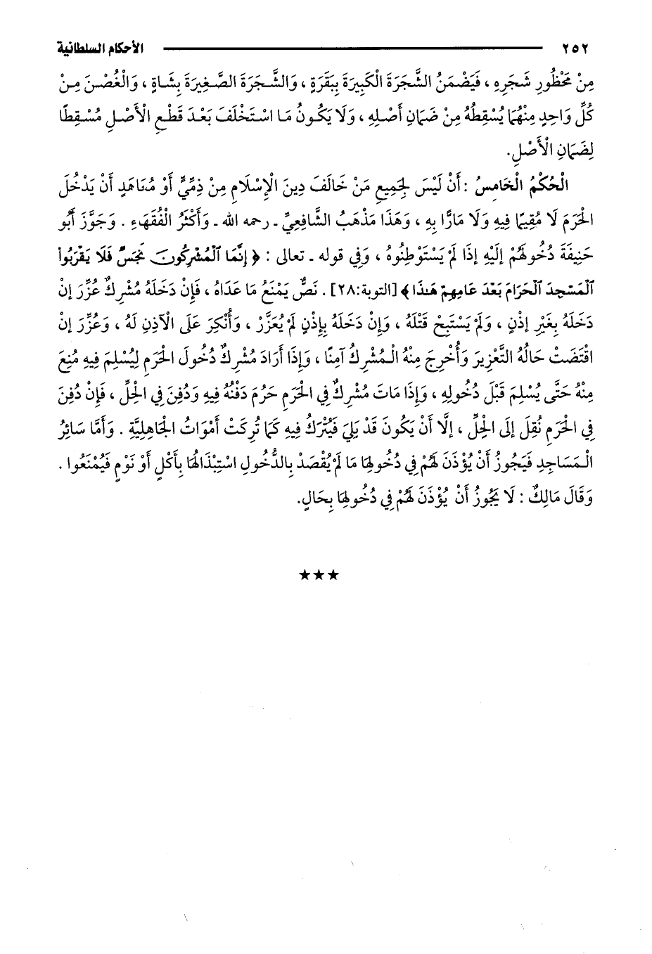 الْحُكْمُ الْخَامِسُ: أَنْ لَيْسَ لِجَمِيعِ مَنْ خَالَفَ دِينَ الْإِسْلَامِ مِنْ ذِمِّيٍّ أَوْ مُعَاهَدٍ أَنْ يَدْخُلَ الْحَرَمَ لَا مُقِيمًا فِيهِ وَلَا مَارًّا بِهِ، وَهَذَا مَذْهَبُ الشَّافِعِيِّ -رَحِمَهُ اللَّهُ- وَأَكْثَرُ الْفُقَهَاءِ.