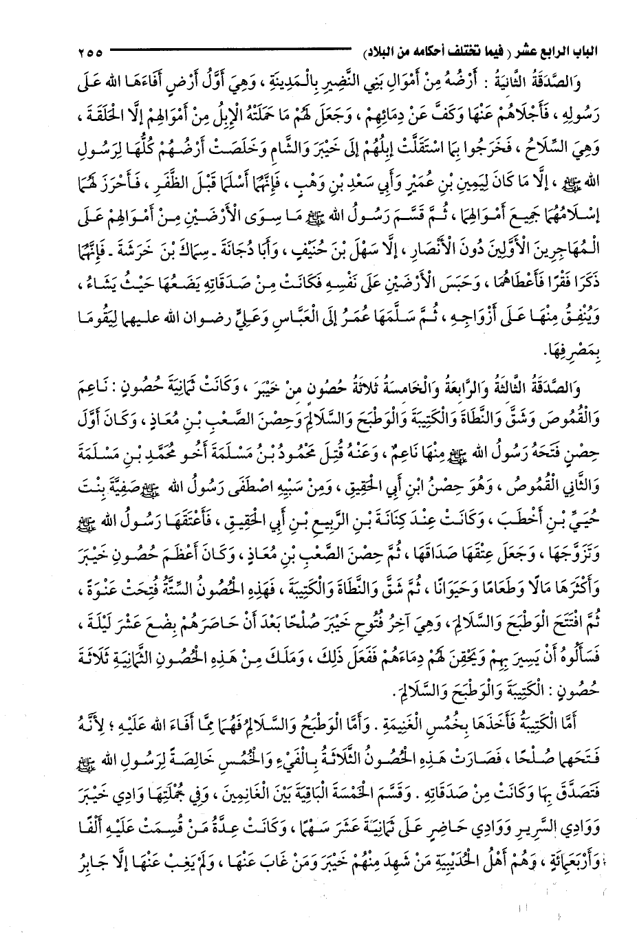 وَالصَّدَقَةُ الثَّالِثَةُ والرابعَةُ وَالْخَامِسَةُ: ثَلَاثَةُ حُصُونٍ مِنْ خَيْبَرَ، وَكَانَتْ ثَمَانِيَةَ حُصُونٍ: نَاعِمَ وَالْقُمُوصَ وَشَقَّ وَالنَّطَاةَ وَالْكَتِيبَةَ وَالْوَطْبَحَ وَالسَّلَالِمَ وَحِصْنَ الصَّعْبِ بْنِ مُعَاذٍ، وَكَانَ أَوَّلَ حِصْنٍ فَتَحَهُ رَسُولُ اللَّهِ -صَلَّى اللَّهُ عَلَيْهِ وَسَلَّمَ- مِنْهَا نَاعِمٌ، وَعَنْهُ قُتِلَ مَحْمُودُ بْنُ مَسْلَمَةَ أَخُو مُحَمَّدِ بْنِ مَسْلَمَةَ، وَالثَّانِي الْقُمُوصُ، وَهُوَ حِصْنُ ابْنِ أَبِي الْحَقِيقِ، وَمِنْ سَبْيِهِ اصْطَفَى رَسُولُ اللَّهِ -صَلَّى اللَّهُ عَلَيْهِ وَسَلَّمَ- صَفِيَّةَ بِنْتَ حُيَيِّ بْنِ أَخْطَبَ، وَكَانَتْ عِنْدَ كِنَانَةَ بْنِ الرَّبِيعِ بْنِ أَبِي الْحَقِيقِ، فَأَعْتَقَهَا رَسُولُ اللَّهِ -صَلَّى اللَّهُ عَلَيْهِ وَسَلَّمَ- وَتَزَوَّجَهَا، وَجَعَلَ عِتْقَهَا صَدَاقَهَا، ثُمَّ حِصْنَ الصَّعْبِ بْنِ مُعَاذٍ، وَكَانَ أَعْظَمَ حُصُونِ خَيْبَرَ وَأَكْثَرَهَا مَالًا وَطَعَامًا وَحَيَوَانًا، ثُمَّ شَقَّ وَالنَّطَاةَ وَالْكَتِيبَةَ، فَهَذِهِ الْحُصُونُ السِّتَّةُ فُتِحَتْ عَنْوَةً، ثُمَّ افْتَتَحَ الْوَطْبَحَ وَالسَّلَالِمَ، وَهِيَ آخِرُ فُتُوحِ خَيْبَرَ صُلْحًا بَعْدَ أَنْ حَاصَرَهُمْ بِضْعَ عَشْرَ لَيْلَةَ، فَسَأَلُوهُ أَنْ يَسِيرَ بِهِمْ وَيَحْقِنَ لَهُمْ دِمَاءَهُمْ فَفَعَلَ ذَلِكَ، وَمَلَكَ مِنْ هَذِهِ الْحُصُونِ الثَّمَانِيَةِ ثَلَاثَةَ حُصُونٍ: الْكَتِيبَةَ وَالْوَطْبَحَ وَالسَّلَالِمَ.