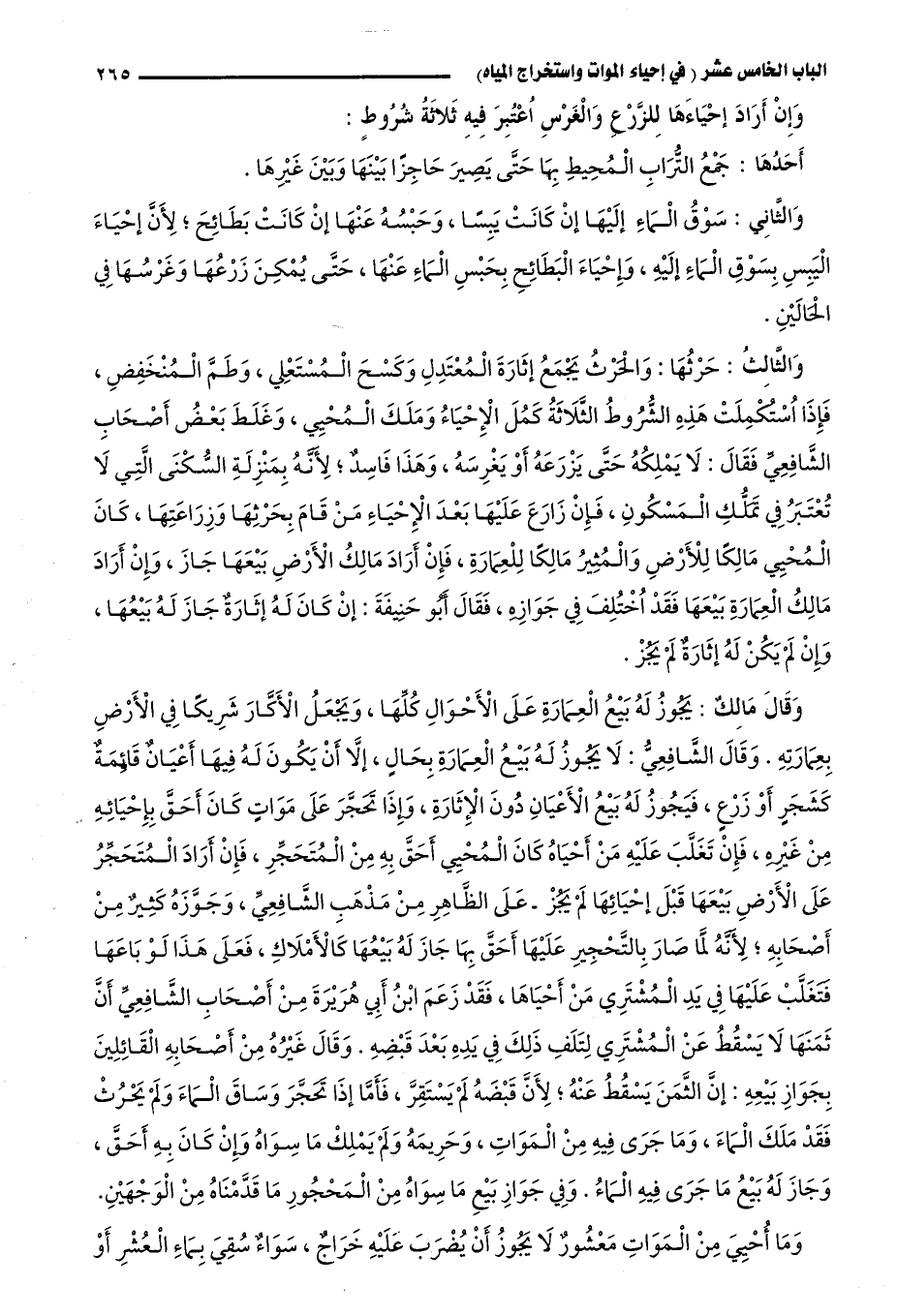 وَالثَّالِثُ: حَرْثُهَا: وَالْحَرْثُ يَجْمَعُ إثَارَةَ الْمُعْتَدِلِ وَكَسْحَ الْمُسْتَعْلِي، وَطَمَّ الْمُنْخَفِضِ، فَإِذَا اُسْتُكْمِلَتْ هَذِهِ الشُّرُوطُ الثَّلَاثَةُ كَمُلَ الْإِحْيَاءُ وَمَلَكَ الْمُحْيِي، وَغَلِطَ بَعْضُ أَصْحَابِ الشَّافِعِيِّ فَقَالَ: لَا يَمْلِكُهُ حَتَّى يَزْرَعَهُ أَوْ يَغْرِسَهُ، وَهَذَا فَاسِدٌ؛ لِأَنَّهُ بِمَنْزِلَةِ السُّكْنَى الَّتِي لَا تُعْتَبَرُ فِي تَمَلُّكِ الْمَسْكُونِ، فَإِنْ زَارَعَ عَلَيْهَا بَعْدَ الْإِحْيَاءِ مَنْ قَامَ بِحَرْثِهَا وَزِرَاعَتِهَا كَانَ الْمُحْيِي مَالِكًا لِلْأَرْضِ، وَالْمُثِيرُ مَالِكًا لِلْعِمَارَةِ، فَإِنْ أَرَادَ مَالِكُ الْأَرْضِ بَيْعَهَا جَازَ، وَإِنْ أَرَادَ مَالِكُ الْعِمَارَةِ بَيْعَهَا فَقَدْ اُخْتُلِفَ فِي جَوَازِهِ، فَقَالَ أَبُو حَنِيفَةَ: إنْ كَانَ لَهُ إثَارَةٌ جَازَ لَهُ بَيْعُهَا، وَإِنْ لَمْ يَكُنْ لَهُ إثَارَةٌ لَمْ يَجُزْ.