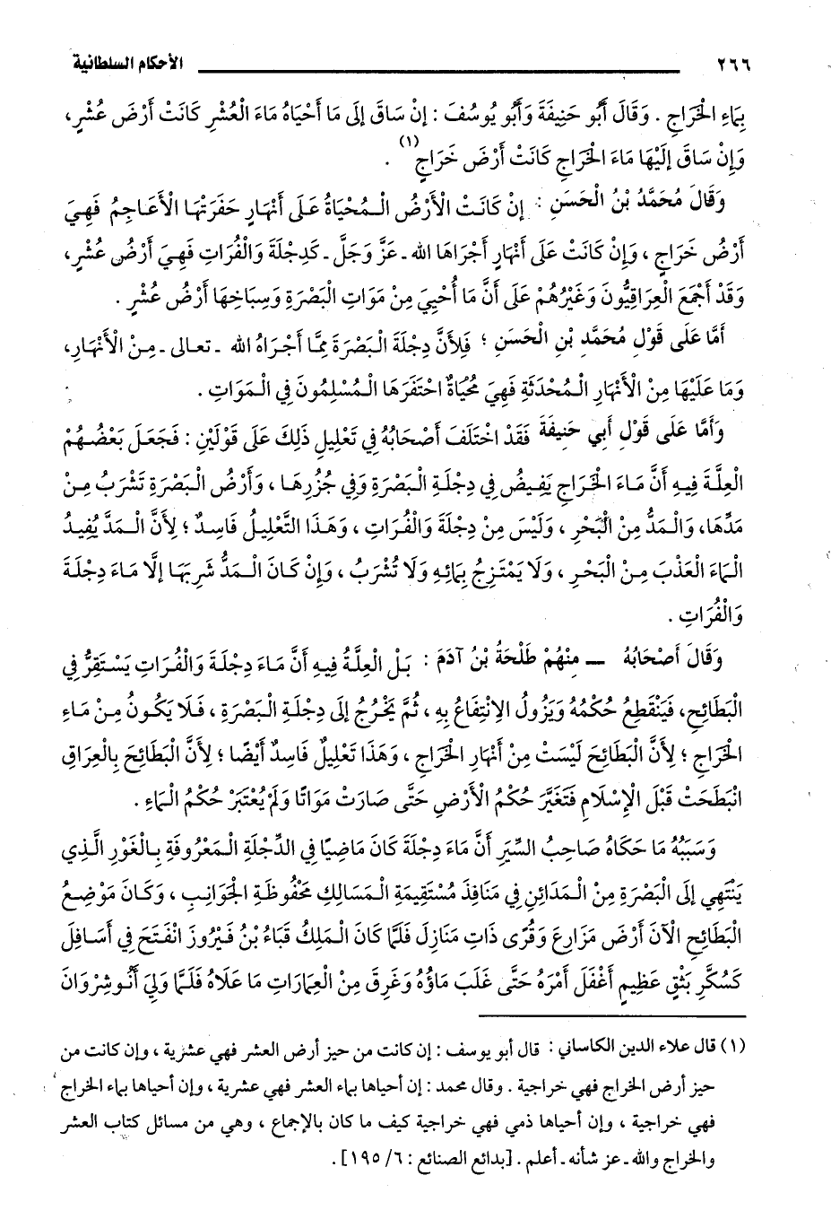 وَقَالَ أَصْحَابُهُ -مِنْهُمْ طَلْحَةُ بْنُ آدَمَ: بَلْ الْعِلَّةُ فِيهِ أَنَّ مَاءَ دِجْلَةَ وَالْفُرَاتِ يَسْتَقِرُّ فِي الْبَطَائِحِ، فَيَنْقَطِعُ حُكْمُهُ وَيَزُولُ الِانْتِفَاعُ بِهِ، ثُمَّ يَخْرُجُ إلَى دِجْلَةِ الْبَصْرَةِ، فَلَا يَكُونُ مِنْ مَاءِ الْخَرَاجِ؛ لِأَنَّ الْبَطَائِحَ لَيْسَتْ مِنْ أَنْهَارِ الْخَرَاجِ، وَهَذَا تَعْلِيلٌ فَاسِدٌ أَيْضًا؛ لِأَنَّ الْبَطَائِحَ بِالْعِرَاقِ انْبَطَحَتْ قَبْلَ الْإِسْلَامِ، فَتَغَيَّرَ حُكْمُ الْأَرْضِ حَتَّى صَارَتْ مَوَاتًا، وَلَمْ يُعْتَبَرْ حُكْمُ الْمَاءِ.