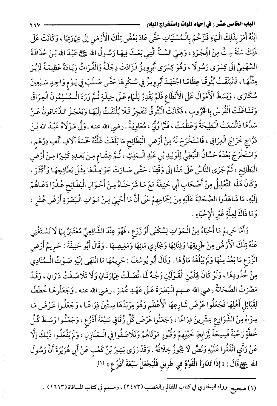 ابْنُهُ أَمَرَ بِذَلِكَ الْمَاءِ فَتَزَحَّمَ بِالْمُسْنَيَاتِ حَتَّى عَادَ بَعْضُ تِلْكَ الْأَرْضِ إلَى عِمَارَتِهَا، وَكَانَتْ عَلَى ذَلِكَ سَنَةَ سِتٍّ مِنَ الْهِجْرَةِ، وَهِيَ السَّنَةُ الَّتِي بَعَثَ فِيهَا رَسُولُ اللَّهِ -صَلَّى اللَّهُ عَلَيْهِ وَسَلَّمَ- عَبْدَ اللَّهِ بْنَ حُذَافَةَ السَّهْمِيَّ إلَى كِسْرَى رَسُولًا، وَهُوَ كِسْرَى أَبْرِوِيزُ، فَزَادَتْ دِجْلَةُ وَالْفُرَاتُ زِيَادَةً عَظِيمَةً لَمْ يُرَ مِثْلُهَا، فَانْبَثَقَتْ بُثُوقًا عِظَامًا اجْتَهَدَ أَبْرِوِيزُ فِي سُكْرِهَا حَتَّى صَلَبَ فِي يَوْمٍ وَاحِدٍ سَبْعِينَ سُكَارَى، وَبَسَطَ الْأَمْوَالَ عَلَى الْأَنْطَاعِ فَلَمْ يَقْدِرْ لِلْمَاءِ عَلَى حِيلَةٍ، ثُمَّ وَرَدَ الْمُسْلِمُونَ الْعِرَاقَ وَتَشَاغَلَتِ الْفُرْسُ بِالْحُرُوبِ، فَكَانَتِ الْبُثُوقُ تَنْفَجِرُ فَلَا يُلْتَفَتُ إلَيْهَا، وَيَعْجَزُ الدَّهَاقِونُ عَنْ سَدِّهَا فَاتَّسَعَتِ الْبَطِيحَةُ وَعَظُمَتْ، فَلَمَّا وُلِّيَ مُعَاوِيَةُ -رَضِيَ اللَّهُ عَنْهُ- وَلَّى مَوْلَاهُ عَبْدَ اللَّهِ بْنَ دَرَّاجٍ خَرَاجَ الْعِرَاقِ، فَاسْتَخْرَجَ لَهُ مِنْ أَرْضِ الْبَطَائِحِ مَا بَلَغَتْ غَلَّتُهُ خَمْسَةَ آلَافِ أَلْفِ دِرْهَمٍ، وَاسْتَخْرَجَ بَعْدَهُ حَسَّانُ النَّبَطِيُّ لِلْوَلِيدِ بْنِ عَبْدِ الْمَلِكِ بَعْدِهِ كَثِيرًا مِنْ أَرْضِ الْبَطَائِحِ، ثُمَّ جَرَى النَّاسُ عَلَى هَذَا إلَى وَقْتِنَا، حَتَّى صَارَتْ جَوَامِدُهَا مِثْلَ بَطَائِحِهَا وَأَكْثَرَ، وَكَانَ هَذَا التَّعْلِيلُ مِنْ أَصْحَابِ أَبِي حَنِيفَةَ مَعَ مَا شَرَحْنَاهُ مِنْ أَحْوَالِ الْبَطَائِحِ عُذْرًا دَعَاهُمْ إلَيْهِ مَا شَاهَدُوا الصَّحَابَةَ عَلَيْهِ مِنْ إجْمَاعِهِمْ عَلَى أَنَّ مَا أُحْيِيَ مِنْ مَوَاتِ الْبَصْرَةِ أَرْضُ عُشْرٍ، وَمَا ذَاكَ لِعِلَّةٍ غَيْرِ الْإِحْيَاءِ.