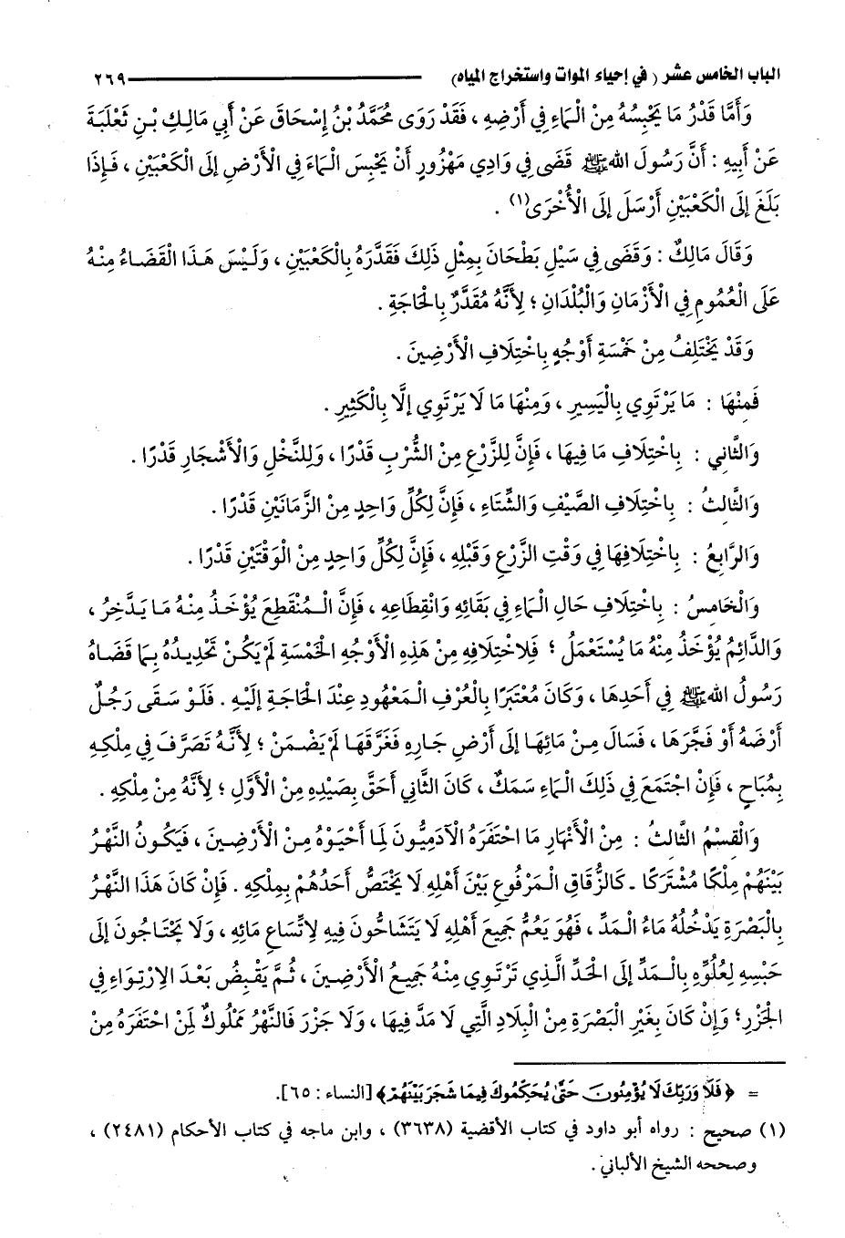 والخامس: باختلاف حال الماء في بقائه وانقطاعه، فإن المنقطع يؤخذ منه ما يدخر، والدائم يؤخذ منه ما يستعمل؛ فلاختلافه من هذه الأوجه الخمسة لم يكن تحديده بما قضاه رسول الله -صلى الله عليه وسلم- في أحدها، وكان معتبرًا بالعرف المعهود عند الحاجه إليه، فلو سقى رجل أرضه أو فجرها، فسال من مائها إلى أرض جاره فغرقها لم يضمن؛ لأنه تصرَّف في ملكه بمباح، فإن اجتمع في ذلك الماء سمك، كان الثاني أحق بصيده من الأول؛ لأنه من ملكه.