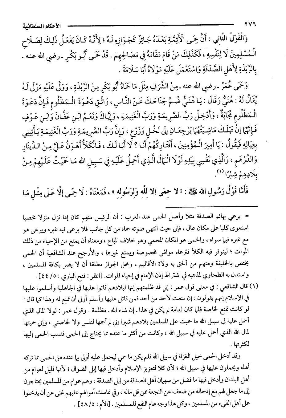 1 قال الشافعي في معني قول عمر: إني قد ظلمتهم، إنَّها لبلادهم قاتوا عليها في الجاهلية وأسلموا عليها في الإسلام، إنهم يقولون: إن منعت لأحد من أحد فمن قاتل عليها وأسلم أولى أن تمنع له، وهذا كما قال: لو كانت تمنع لخاصة فلما كان لعامة لم يكن في هذا -إن شاء الله- مظلمة. وقول عمر: لولا المال الذي أحمل عليه في سبيل الله ما حميت على المسلمين بلادهم شبرًا، إني لم أحمها لنفسي ولا لخاصَّتي، وإني حميتها لمال الله أحمل عليه في سبيل الله، وكانت من أكثر ما عنده مما يحتاج إلى الحمى، فنسب الحمى إليها لكثرتها.
