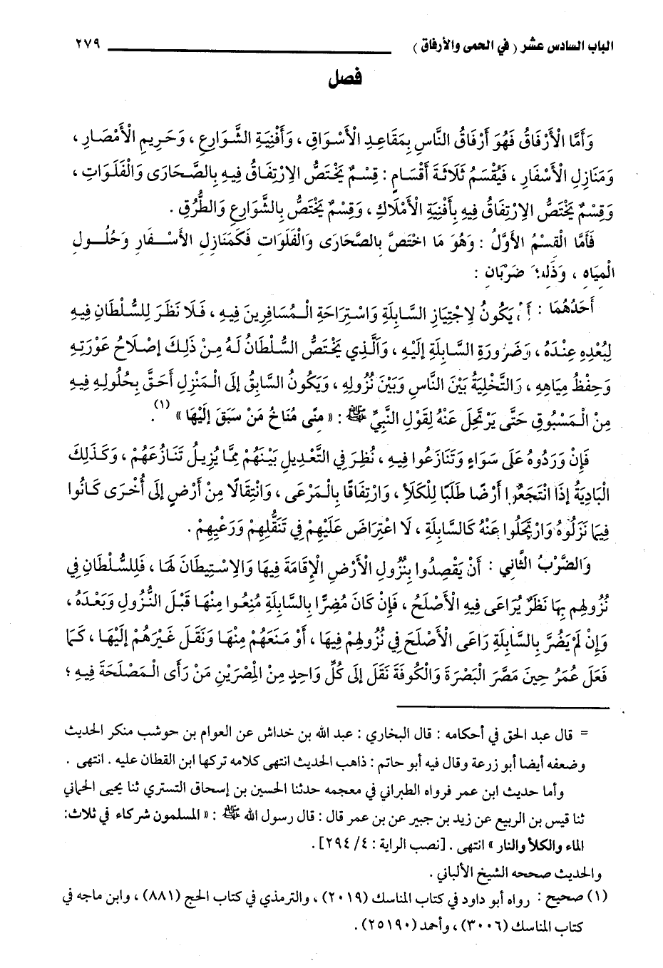 أحدهما: أن يكون لاجيتاز السابلة واستراحة المسافرين فيه، فلا نظر للسلطان فيه لبعده عنده، وضرورة السابلة إليه، والذي يختص السلطان له من ذلك إصلاح عورته وحفظ مياهه، والتخلية بين الناس وبين نزوله، ويكون السابق إلى المنزل أحقّ بحلوله فيه من المسبوق حتى يرتحل عنه؛ لقول النبي -صلى الله عليه وسلم: "مِنَى مناخ من سبق إليها" 1.