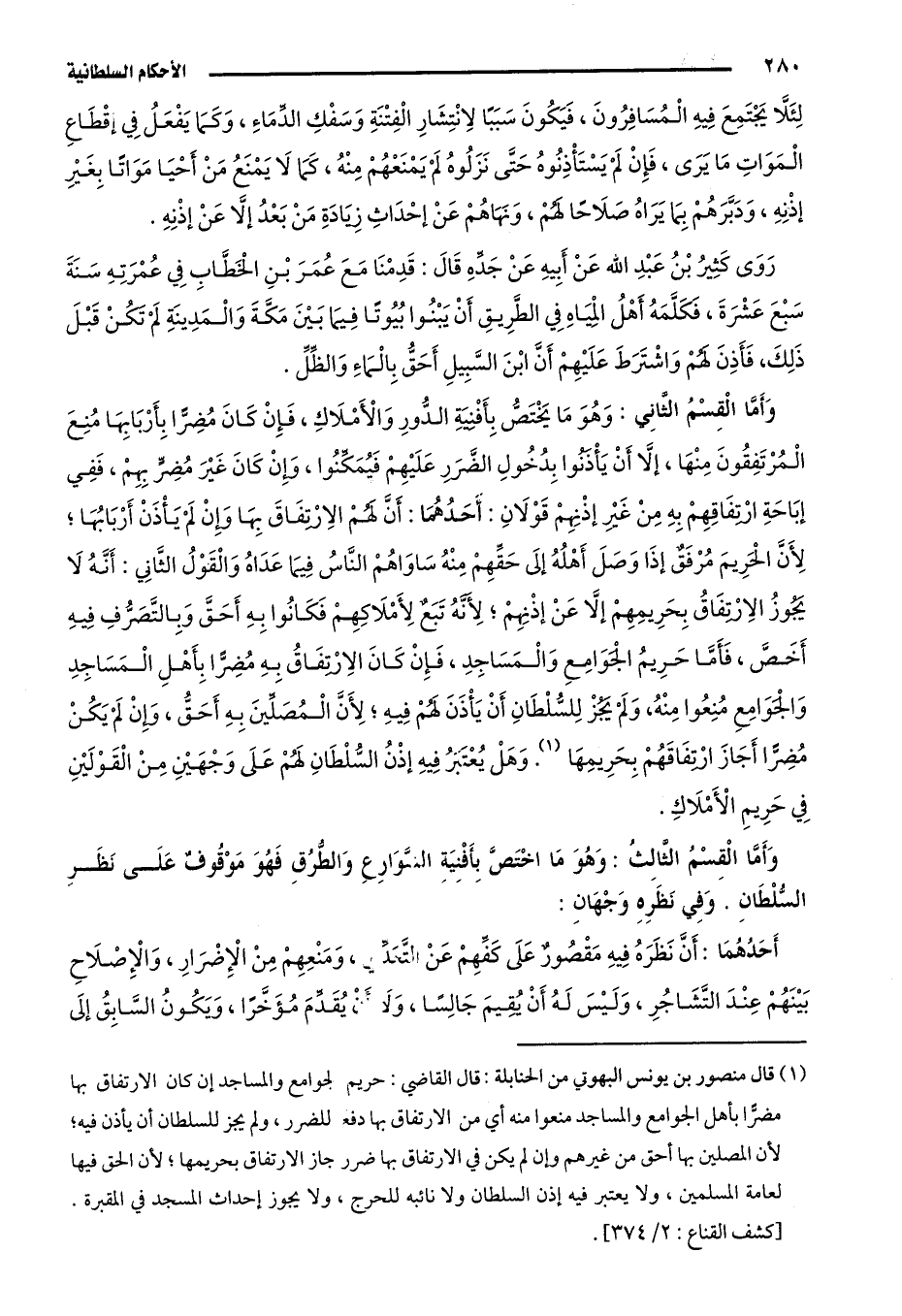 والقول الثاني: أنه لا يجوز الارتفاق بحريمهم إلَّا عن إذانهم؛ لأنه تبع لأملاكهم، فكانوا به أحق وبالتصرف فيه أخص، فأمَّا حريم الجوامع والمساجد فإن كان الارتفاق به مضرًّا بأهل المساجد والجوامع منعوا منه، ولم يجز للسلطان أن يأذن لهم فيه؛ لأنَّ المصلين به أحق، وإن لمن يكن مضرًّا أجاز ارتفاقهم بحريمها1. وهل يعتبر فيه إذن السلطان لهم على وجهين منَ القولين في حريم الأملاك.