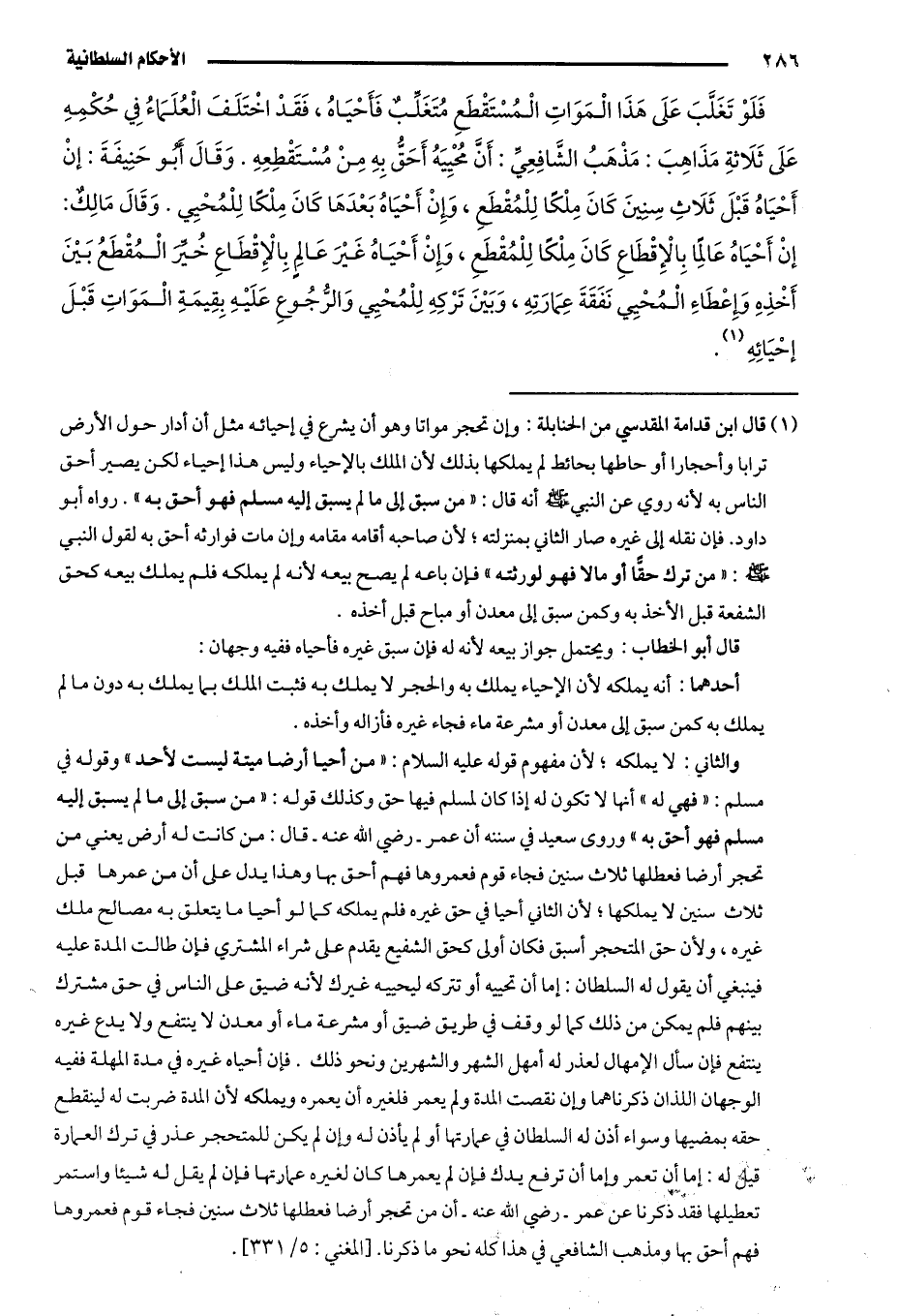 1 قال ابن قدامة المقدسي -من الحنابلة: وإن تحجَّر مواتًا وهو أن يشرع في إحيائه مثل أن أدار حول الأرض ترابًا وأحجارًا أو حاطها لم يملكها بذلك؛ لأن الملك بالإحياء وليس هذا إحياء، لكن يصير أحق الناس به؛ لأنه روي عن النبي -صلى الله عليه وسلم- أنه قال: "من سبق إلى ما لم يسبق إليه مسلم فهو أحق به" رواه أبو داود. فإن نقله إلى غيره صار الثاني بمنزلته؛ لأن صاحبه أقامه مقامه، وإن مات فوارثه أحق به؛ لقول النبي -صلى الله عليه وسلم: "من ترك حقًّا أو مالًا فهو لورثته"، فإن باعه لم يصح بيعه؛ لأنه لم يملكه، فلم يملك بيعه كحق الشفعة قبل الأخذ به، وكمن سبق إلى معدن أو مباح قبل أخذه.