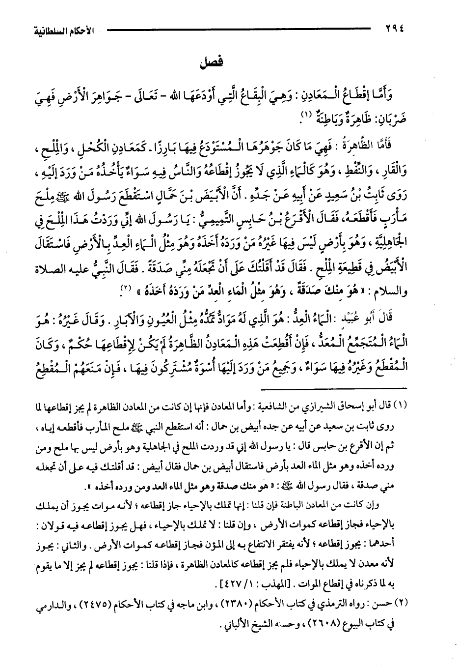 1 قال أبو إسحاق الشيرازي -من الشافعية: وأمَّا المعادن فإنَّها إن كانت من المعادن الظاهرة لم يجز إقطاعها؛ لما روى ثابت بن سعيد بن أبيه عن جده أبيض بن حمَّال أنه استقطع النبي -صلى الله عليه وسلم- ملح المأرب فأقطعه إياه، ثم إنَّ الأقرع بن حابس قال: يا رسول الله، إني قد وردت الملح في الجاهلية وهو بأرض ليس بها ملح ومن وَردَه أخذه، وهو مثل الماء العد بأرض، فاستقال أبيض بن حمَّال فقال أبيض: قد أقلتك فيه على أن تجعله مني صدقة، فقال رسول الله -صلى الله عليه وسلم: "هو منك صدقة وهو مثل الماء العد ومن ورده أخذه".