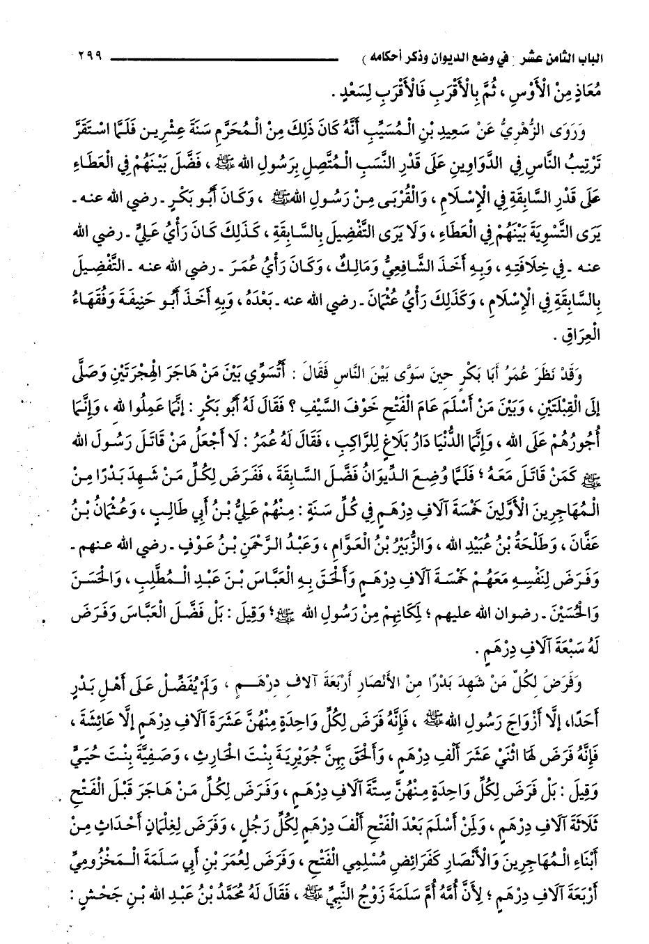 وروى الزهري عن سعيد بن المسيب أنَّه كان ذلك من المحرَّم سنة عشرين، فلمَّا استقرَّ ترتيب الناس في الدواوين على قدر النسب المتَّصل برسول الله -صلى الله عليه وسلم، فضَّل بينهم في العطاء على قدر السابقة في الإسلام، والقربى من رسول الله -صلى الله عليه وسلم، وكان أبو بكر -رضي الله عنه- يرى التسوية بينهم في العطاء، ولا يرى التفضيل بالسابقة، كذلك كان رأي علي -رضي الله عنه- في خلافته، وبه يأخذ الشافعي ومالك، وكان رأي عمر -رضي الله عنه- التفضيل بالسابقة في الإسلام، وكذلك رأي عثمان -رضي الله عنه- بعده، وبه أخذ أبو حنيفة وفقهاء العراق.