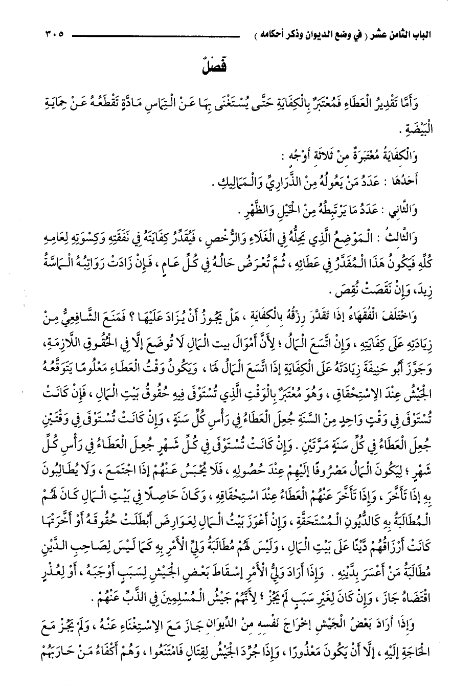 والثالث: الموضع الذي يحله في الغلاء والرخص، فيقدَّر كفايته في نفقته وكسوته لعامه كله، فيكون هذا المقدر في عطائه، ثم تعرض حاله في كل عام، فإن زادت رواتبه الماسَّة زيد، وإن نقصت نقص.