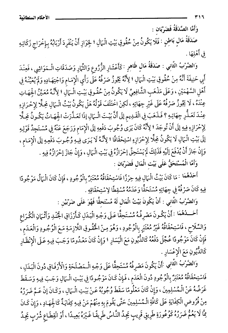 والضرب الثاني: أن يكون مصرفه مستحقًّا على وجه المصلحة والأرفاق دون البدل، فاستحقاقه معتبر بالوجود دون العدم، فإن كان موجودًا في بيت المال وجب فيه وسقط غرضه عن المسلمين، وإن كان معلومًا سقط وجوبه عن بيت المال، وكان إن عمَّ ضرره من فروض الكفاية على كافة المسلمين حتى يقوم به منهم من فيه كفاية كالجهاد، وإن كان مما لا يعم ضرره كوعورة طريق قريب يجد الناس طريقًا غيره بعيدًا، أو انقطاع شرب يجد