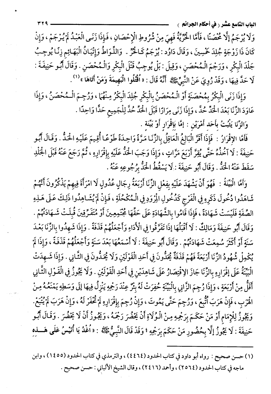 ولا يرجم إلّا محصنًا، فأمَّا الحرية فهي من شروط الإحصان، فإذا زنى العبد لم يرجم، وإن كان ذا زوجة جلد خمسين، وقالد داود: يرجم كالحر. واللواط وإتيان البهائم زنًا يوجب جلد البكر، ورجم المحصن، وقيل: بل يوجب قتل البكر والمحصن. وقال أبو حنيفة: لا حدَّ فيها، وقد روي عن النبي -صلى الله عليه وسلم- أنه قال: "اقتلوا البهيمة ومن أتاها" 1.