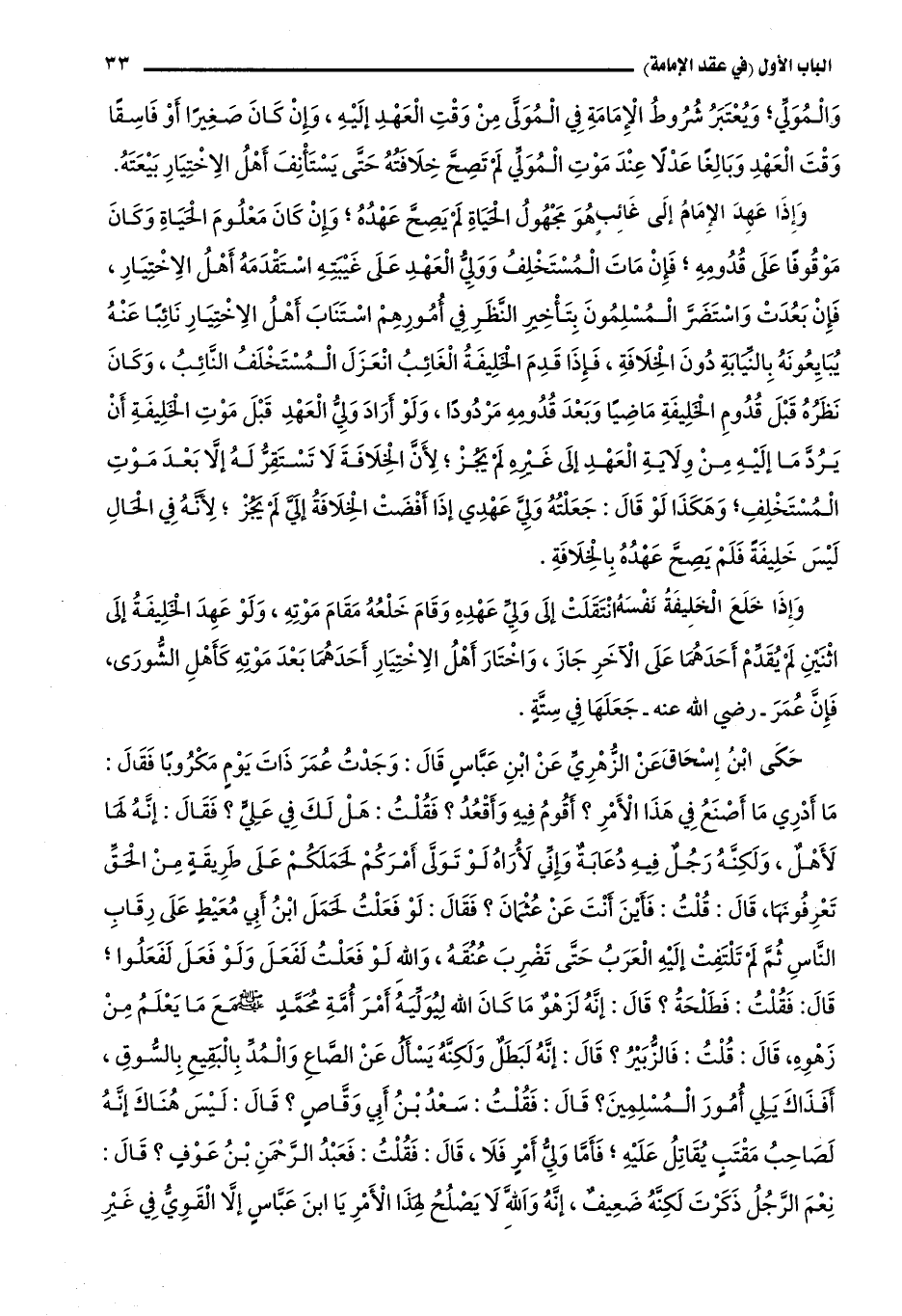 حَكَى ابْنُ إِسْحَاقَ عَنِ الزُّهْرِيِّ عَنِ ابْنِ عَبَّاسٍ قَالَ: وَجَدْتُ عُمَرَ ذَاتَ يَوْمٍ مَكْرُوبًا، فَقَالَ: مَا أَدْرِي مَا أَصْنَعُ فِي هَذَا الْأَمْرِ؟ أَقُومُ فِيهِ وَأَقْعُدُ؟ فَقُلْتُ: هَلْ لَكَ فِي عَلِيٍّ؟ فَقَالَ: إنَّهُ لَهَا لَأَهْلٌ، وَلَكِنَّهُ رَجُلٌ فِيهِ دُعَابَةٌ، وَإِنِّي لَأُرَاهُ لَوْ تَوَلَّى أَمْرَكُمْ لَحَمَلَكُمْ عَلَى طَرِيقَةٍ مِنَ الْحَقِّ تَعْرِفُونَهَا، قَالَ: قُلْتُ: فَأَيْنَ أَنْتَ عَنْ عُثْمَانَ؟ فَقَالَ: لَوْ فَعَلْتُ لَحَمَلَ ابْنُ أَبِي مُعَيْطٍ عَلَى رِقَابِ النَّاسِ، ثُمَّ لَمْ تَلْتَفِتْ إلَيْهِ الْعَرَبُ حَتَّى تَضْرِبَ عُنُقَهُ، وَاَللَّهِ لَوْ فَعَلْتُ لَفَعَلَ، وَلَوْ فَعَلَ لَفَعَلُوا؛ قَالَ: فَقُلْتُ: فَطَلْحَةُ، قَالَ: إنَّهُ لَزَهْوٌ، مَا كَانَ اللَّهُ لِيُوَلِّيَهُ أَمْرَ أُمَّةِ مُحَمَّدٍ -صَلَّى اللَّهُ عَلَيْهِ وَسَلَّمَ- مَعَ مَا يَعْلَمُ مِنْ زَهْوِهِ، قَالَ: قُلْتُ: فَالزُّبَيْرُ، قَالَ: إنَّهُ لَبَطَلٌ وَلَكِنَّهُ يَسْأَلُ عَنِ الصَّاعِ وَالْمُدِّ بِالْبَقِيعِ بِالسُّوقِ، أَفَذَاكَ يَلِي أُمُورَ الْمُسْلِمِينَ؟ قَالَ: فَقُلْتُ: سَعْدُ بْنُ أَبِي وَقَّاصٍ، قَالَ: لَيْسَ هُنَاكَ إنَّهُ لَصَاحِبُ مَقْتَبٍ يُقَاتِلُ عَلَيْهِ، فَأَمَّا وَلِيُّ أَمْرٍ فَلَا، قَالَ: فَقُلْتُ: فَعَبْدُ الرَّحْمَنِ بْنُ عَوْفٍ، قَالَ: نِعْمَ الرَّجُلُ ذَكَرْتَ لَكِنَّهُ ضَعِيفٌ، إنَّهُ وَاَللَّهِ لَا يَصْلُحُ لِهَذَا الْأَمْرِ يَا ابْنَ عَبَّاسٍ إلَّا الْقَوِيُّ فِي غَيْرِ