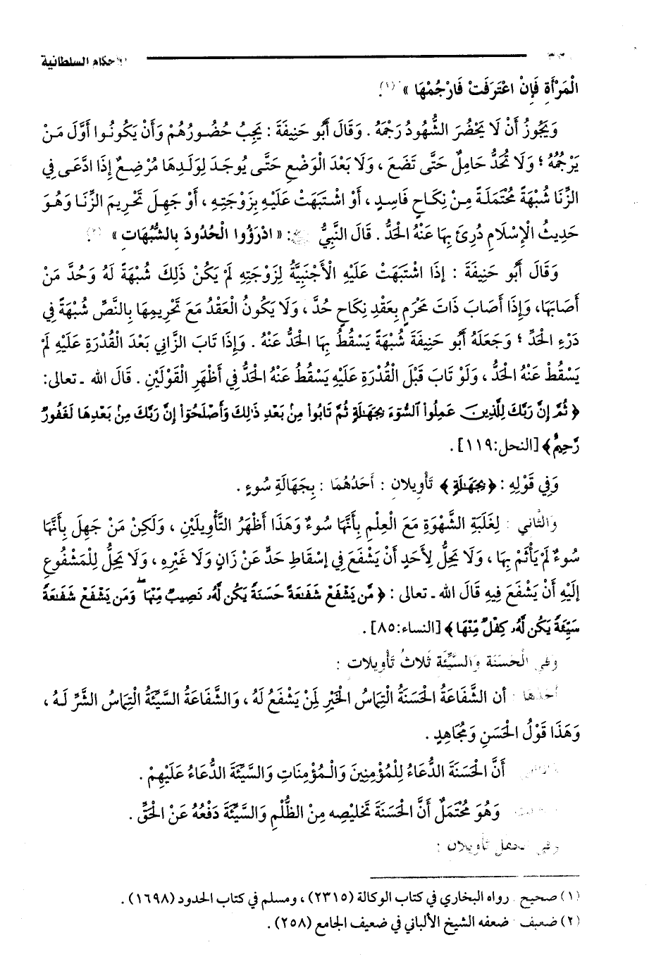 والثاني: لغلبة الشهوة مع العلم بأنَّها سوء وهذا أظهر التأويلين، ولكن من جهل بأنها سوء لم يأثم بها، ولا تحل لأحد أن يشفع في إسقاط حد عن زانٍ ولا غيره، ولا يحل للمشفوع إليه أن يشفع فيه، قال الله تعالى: {مَنْ يَشْفَعْ شَفَاعَةً حَسَنَةً يَكُنْ لَهُ نَصِيبٌ مِنْهَا وَمَنْ يَشْفَعْ شَفَاعَةً سَيِّئَةً يَكُنْ لَهُ كِفْلٌ مِنْهَا} [النساء: 85] .