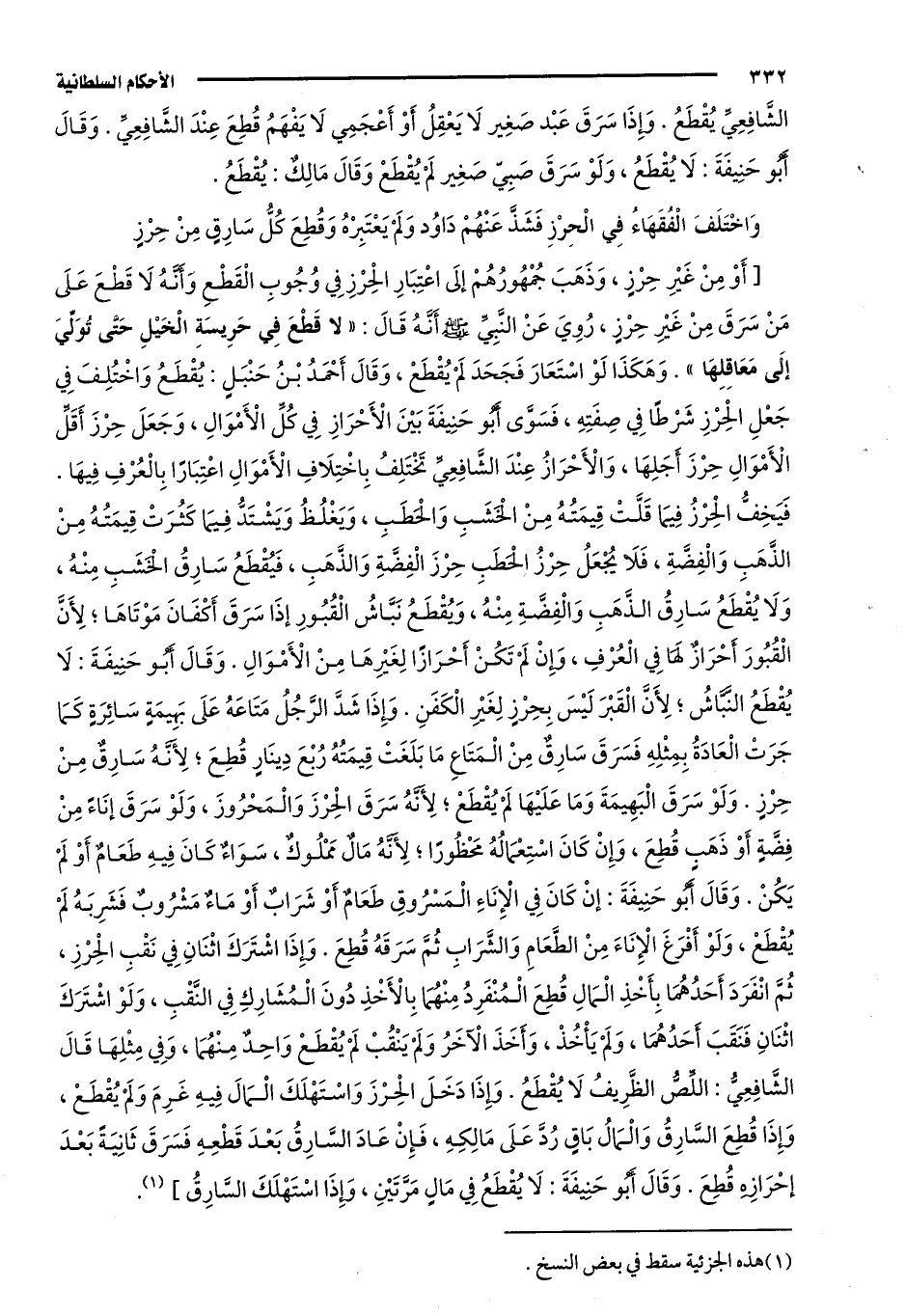 فيخف الحرز فيما قلَّت قيمته من الخشب والحطب، ويغلظ ويشتد فيما كثرت قيمته من الذهب والفضة، فلا يجعل حرز الفضة والذهب، فيقطع سارق الخشب منه، ولا يقطع سارق الذهب والفضه منه، ويقطع نباش القبور إذا سرق أكفان موتاها؛ لأن القبور أحراز لها في العرف، وإن لم تكن أحرازًا لغيرها من الأموال. وقال أبو حنيفة: لا يقطع النباش؛ لأنَّ القبر ليس بحرز لغير الكفن. وإذا شد الرجل متاعه على بهيمة سائرة كما جرت العادة بمثله فسرق سارق من المتاع ما بلغت قيمته ربع دينار قطع؛ لأنه سارق من حرز، ولو سرق البهيمة وما عليها لم يقطع؛ لأنه سرق الحرز والمحروز، ولو سرق إناء من فضة أو ذهب قطع، وإن كان استعماله محظورًا؛ لأنه مال مملوك، سواء كان فيه طعام أو لم يكن. وقال أبو حنيفة: إن كان في الإناء المسروق طعام أو شراب أو ماء مشروب فشربه لم يقطع، ولو أفرغ الإناء من الطعام والشراب ثم سرقه قطع. وإذا اشترك اثنان في نقب الحرز، ثم انفرد أحدهما بأخذ المال قطع المنفرد منهما بالأخذ دون المشارك في النقب، ولو اشترك اثنان فنقب أحدهما ولم يأخذ، وأخذ الآخر ولم ينقب، لم يقطع واحد منهما، وفي مثلها قال الشافعي: اللص الظريف لا يقطع. وإذا دخل الحرز واستهلك المال فيه غرم ولم يقطع، وإذا قطع السارق والمال باقٍ رد على مالكه، فإن عاد السارق بعد قطعه فسرق ثانية بعد إحرازه قطع. وقال أبو حنيفة: لا يقطع في مال مرتين، وإذا استهلك السارق] 1.