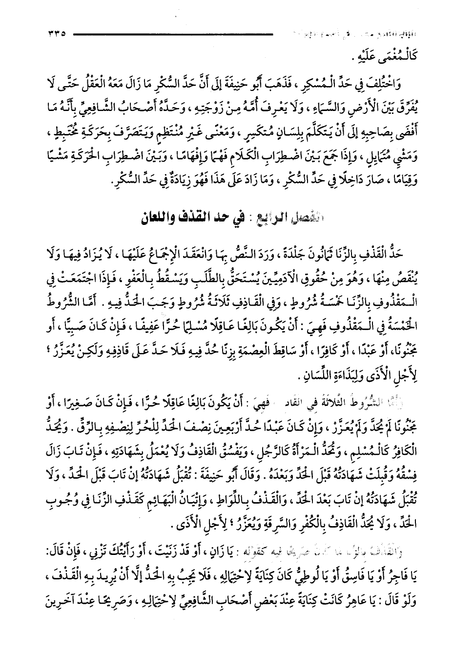 حد القذف بالزنا ثمانون جلدة، ورد النص بها وانعقد الإجماع عليها، لا يزاد فيها ولا ينقص منها، وهو من حقوق الآدميين يستحق بالطلب ويسقط بالعفو، فإذا اجتمعت في المقذوف بالزنا خمسة شروط، وفي القاذف ثلاثة شروط، وجب الحد فيه. أمَّا الشروط الخمسة في المقذوف فهي: أن يكون بالغًا عاقلًا مسلمًا حرًّا عفيفًا، فإن كان صبيًّا أو مجنونًا أو عبدًا أو كافرًا، أو ساقط العصمة بزنا حد فيه حد على قاذفه ولكن يعزر؛ لأجل الأذى ولبذاءة اللسان.