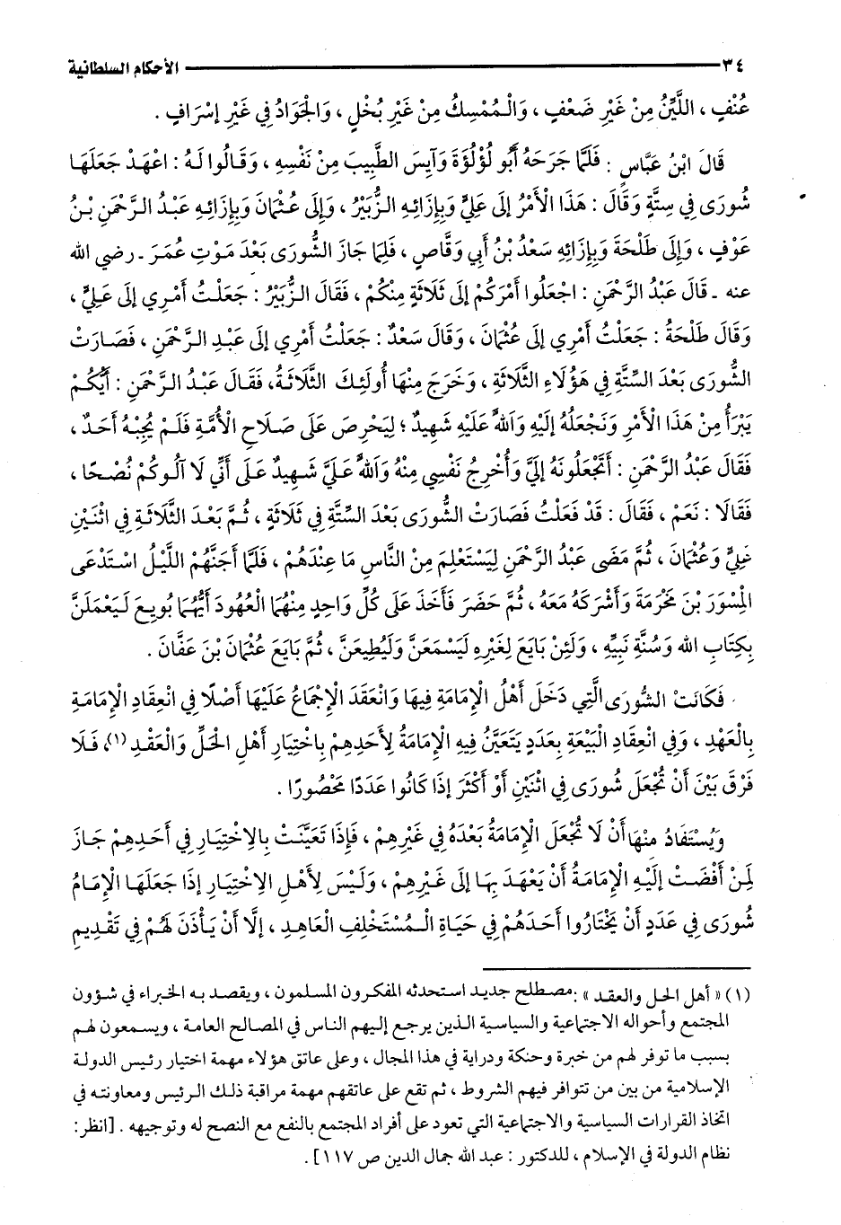 1 "أهل الحل والعقد": مصطلح جديد استحدثه المفكرون المسلمون، ويقصَد به: الخبراء في شئون المجتمع وأحواله الاجتماعية والسياسية، يرجع إليهم الناس في المصالح العامة، ويسمعون لهم بسبب ما توفَّر لهم من خبرة وحنكة ودراية في هذا المجال، وعلى عاتق هؤلاء مهمَّة اختيار رئيس الدولة الإسلامية من بين مَنْ تتوافر فيهم الشروط، ثم تقع على عاتقهم مهمة مراقبة ذلك الرئيس ومعاونته في اتخاذ القرارات السياسية والاجتماعية التي تعود على أفراد المجتمع بالنفع مع النصح له وتوجيهه. "انظر: نظام الدولة في الإسلام، للدكتور: عبد الله جمال الدين: ص117".
