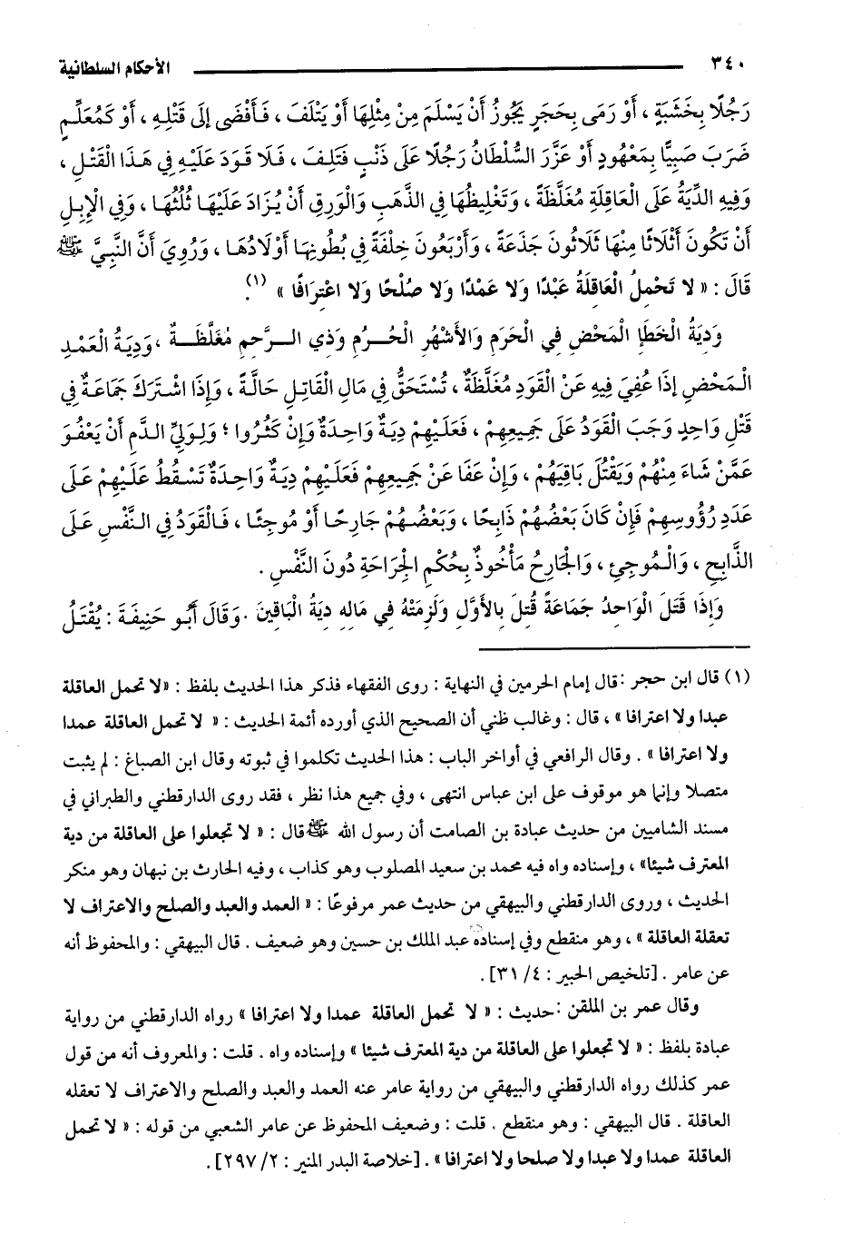1 قال ابن حجر: قال إمام الحرمين في النهاية: روى الفقهاء فذكر هذا الحديث بلفظ: "لا تحمل العاقلة عبدًا ولا اعترافًا"، قال: وغالب ظني أن الصحيح الذي أورده أئمة الحديث: "لا تحمل العاقلة عمدًا ولا اعترافًا". وقال الرافعي في أواخر الباب: هذا الحديث تكلموا في ثبوته. وقال ابن الصباغ: لم يثبت متصلًا وإنما هو موقوف على ابن عباس. انتهى، وفي جميع هذا نظر، فقد روى الدارقطني والطبراني في مسند الشاميين من حديث عبادة بن الصامت أنَّ رسول الله -صلى الله عليه وسلم- قال: "لا تجعلوا على العاقلة من دية المعترف شيئًا"، وإسناده واهٍ، فيه محمد بن سعيد المصلوب وهو كذَّاب، وفيه الحارث بن نبهان وهو منكر الحديث، وروى الدارقطني والبيهقي من حديث عمر مرفوعًا: "العمد والعبد والصلح والاعتراف لا تعقله العاقلة"، وهو منقطع في إسناده عند الملك بن حسين وهو ضعيف. قال البيهقي: والمحفوظ أنَّه عن عامر. [تلخيص الحبير: 4/ 31] .
