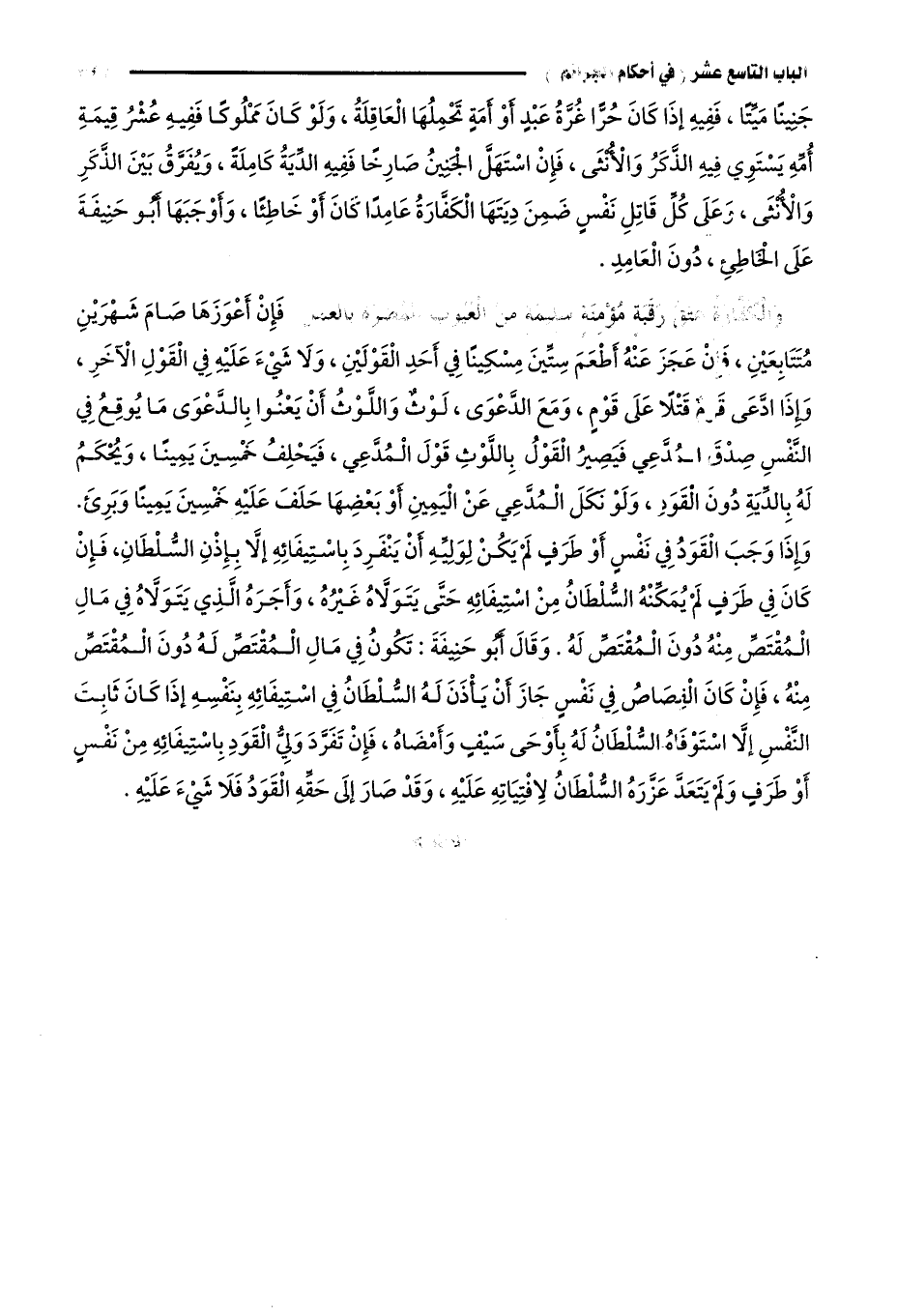 جنينًا ميتًا، ففيه إذا كان حرًّا غرة عبد أو أمة تحملها العاقلة، ولو كان مملوكًا ففيه عشر قيمة أمه يستوي فيه الذكر والأنثى، فإن استهلَّ الجنين صارخًا ففيه الدية كاملة، ويفرق بين الذكر والأنثى، وعلى كل قاتل نفس ضمن ديتها الكفارة عامدًا كان أو خاطئًا، وأوجبها أبو حنيفة على الخاطئ دون العامد.