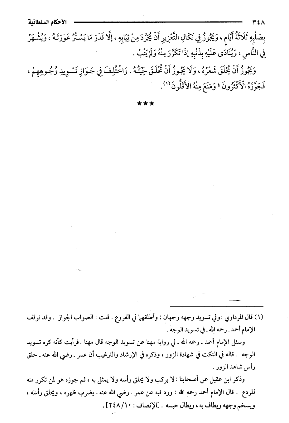 1 قال المرداوي: وفي تسويد وجهه وجهان: وأطلقهما في الفروع. قلت: الصواب الجواز. وقد توقف الإمام أحمد -رحمه الله- في تسويد الوجه.