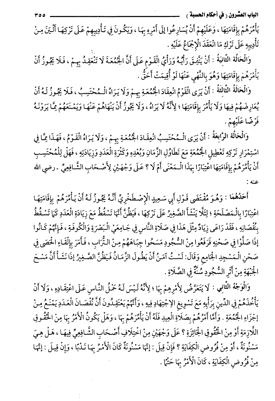 والحالة الرابعة: أن يرى المحتسب انعقاد الجمعة بهم، ولا يراه القوم، فهذا مما في استمرار تركه تعطيل الجمعة مع تطاول الزمان وبعده وكثرة العدد وزيادته، فهل للمحتسب أن يأمرهم بإقامتها اعتبارا بهذا المعنى أم لا؟ على وجهين لأصحاب الشافعي -رضي الله عنه: